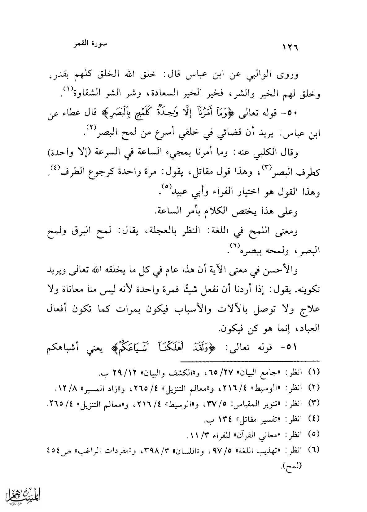 50 - قوله تعالى {وَمَا أَمْرُنَا إِلَّا وَاحِدَةٌ كَلَمْحٍ بِالْبَصَرِ} قال عطاء عن ابن عباس: يريد أن قضائي في خلقي أسرع من لمح البصر (¬2).