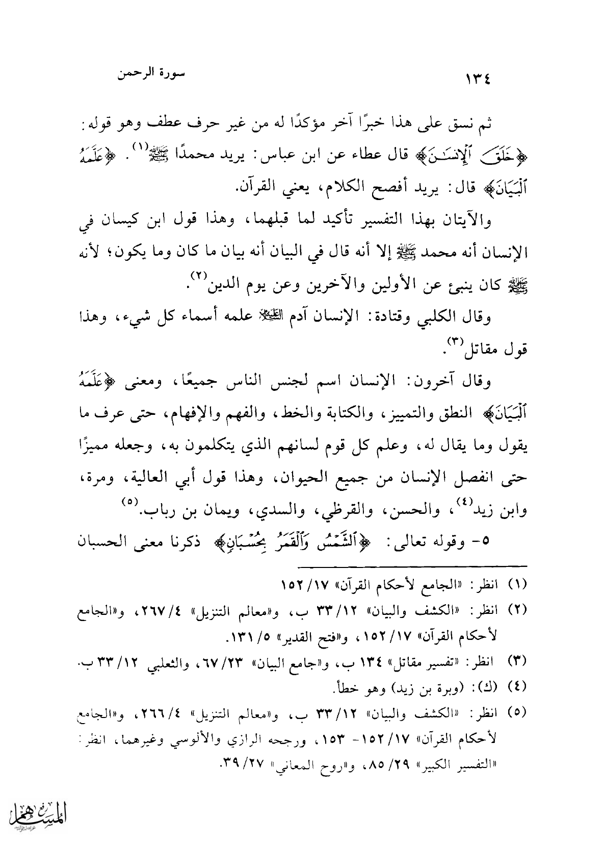 وقال آخرون: الإنسان اسم لجنس الناس جميعًا، ومعنى {عَلَّمَهُ الْبَيَانَ} النطق والتمييز، والكتابة والخط، والفهم والإفهام، حتى عرف ما يقول وما يقال له، وعلم كل قوم لسانهم الذي يتكلمون به، وجعله مميزًا حتى انفصل الإنسان من جميع الحيوان، وهذا قول أبي العالية، ومرة، وابن زيد (¬4)، والحسن، والقرظي، والسدي، ويمان بن رباب. (¬5)