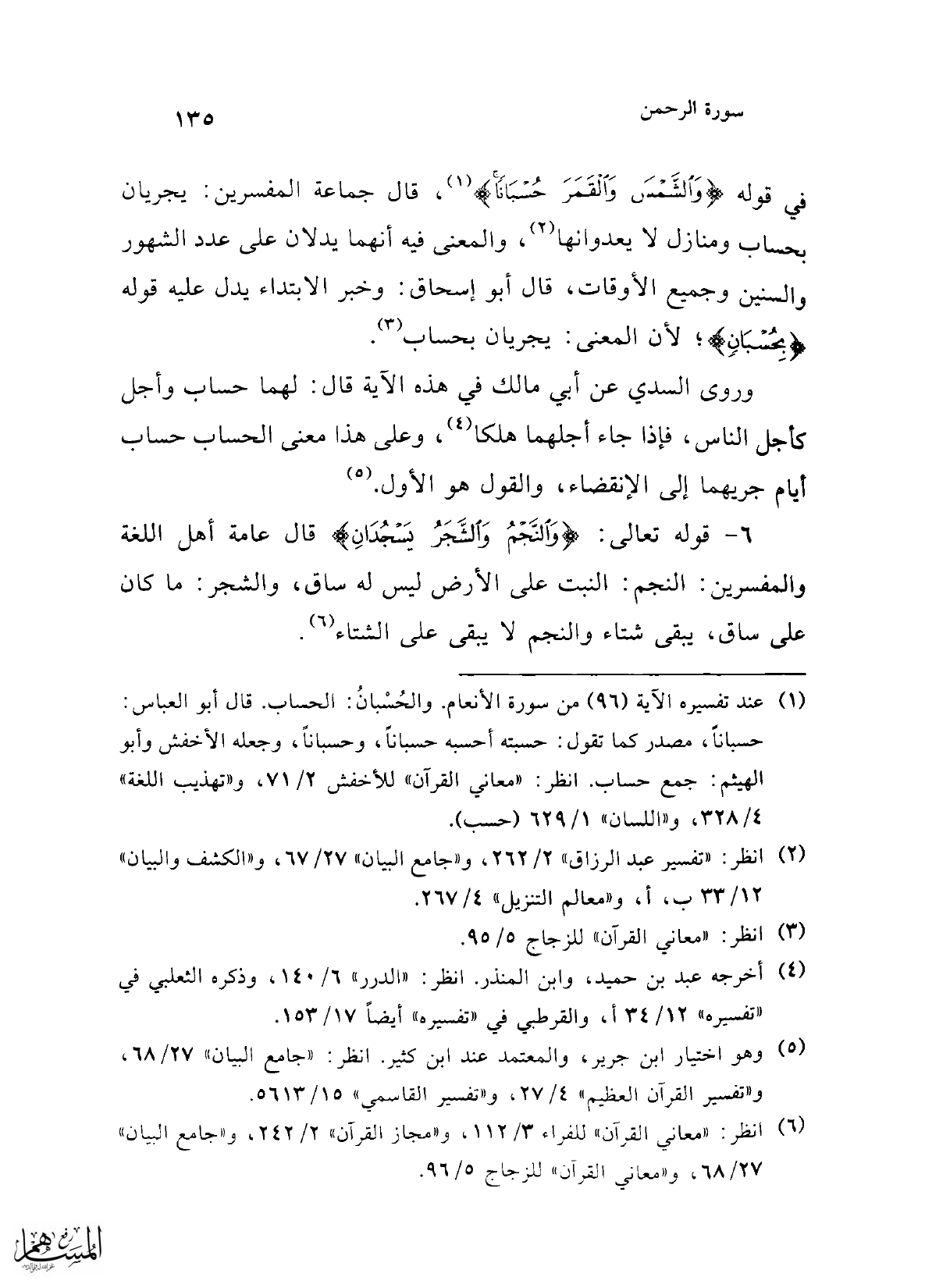 (¬1) عند تفسيره الآية (96) من سورة الأنعام. والحُسْبانُ: الحساب. قال أبو العباس: حسبانًا، مصدر كما تقول: حسبته أحسبه حسبانًا، وحسبانًا، وجعله الأخفش وأبو الهيثم: جمع حساب. انظر: "معاني القرآن" للأخفش 2/ 71، و"تهذيب اللغة" 4/ 328، و"اللسان" 1/ 629 (حسب).