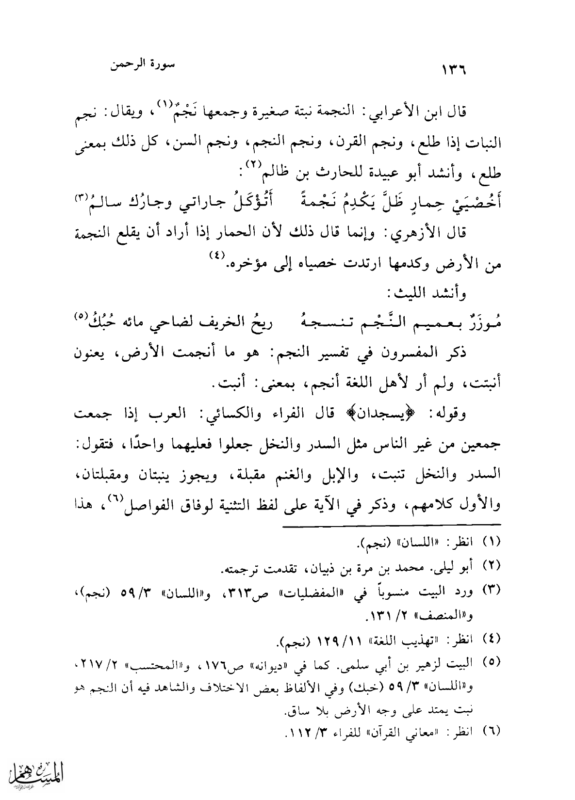 (¬5) البيت لزهير بن أبي سلمى. كما في "ديوانه" ص 176، و"المحتسب" 2/ 217، و"اللسان" 3/ 59 (خبك) وفي الألفاظ بعض الاختلاف والشاهد فيه أن النجم هو نبت يمتد على وجه الأرض بلا ساق.