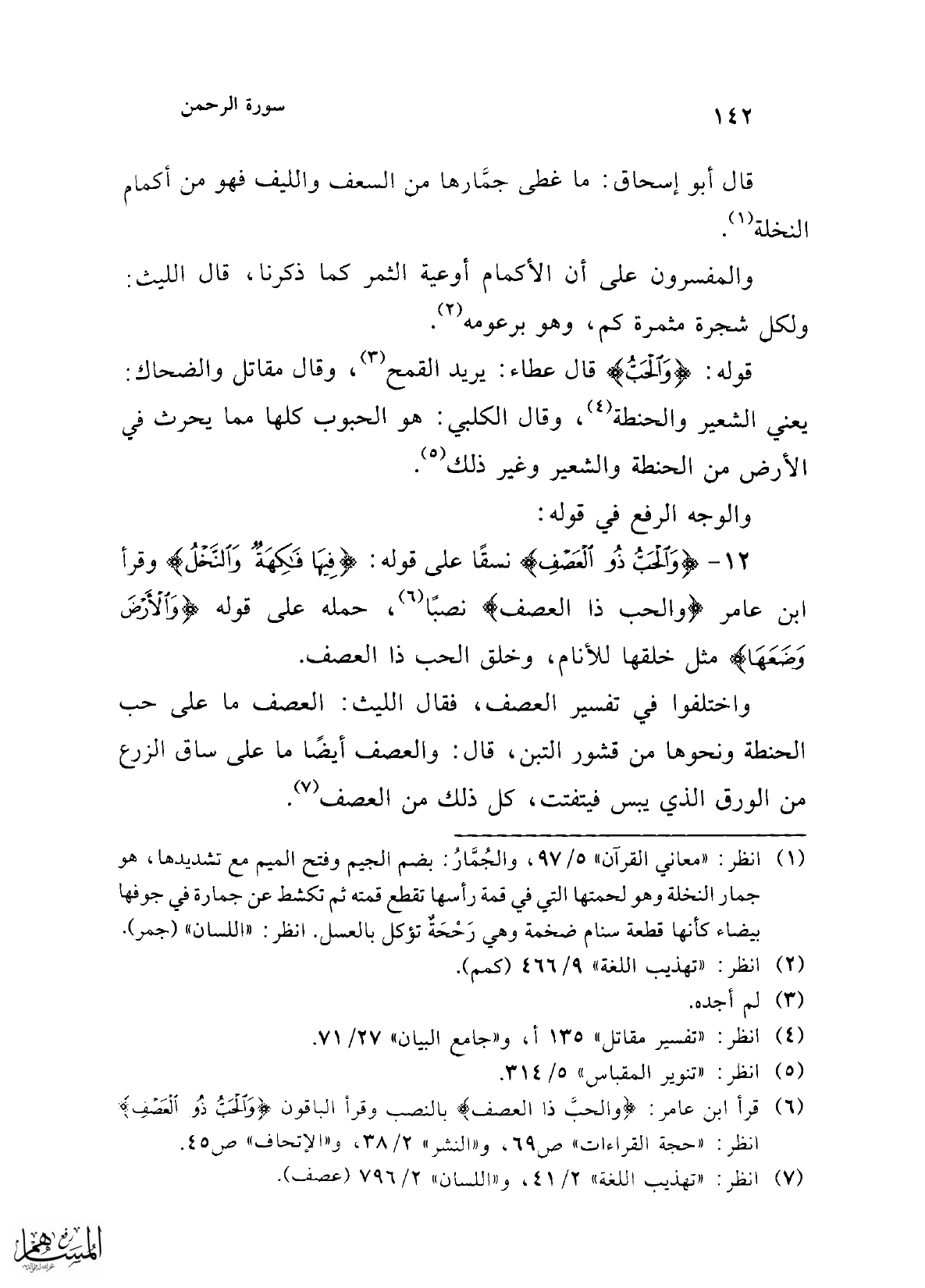 (¬6) قرأ ابن عامر: {والحبَّ ذا العصف} بالنصب وقرأ الباقون {وَالْحَبُّ ذُو الْعَصْفِ} انظر: "حجة القراءات" ص 69، و"النشر" 2/ 38، و"الإتحاف" ص 45.