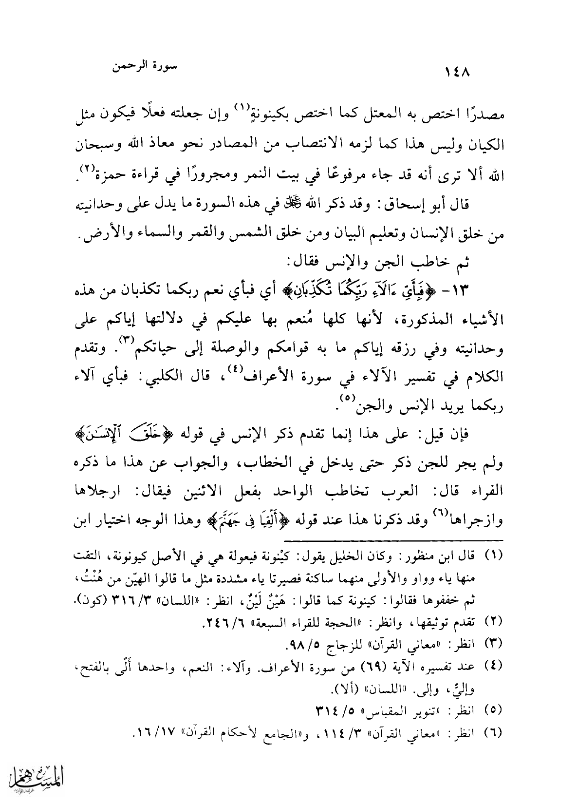 قال أبو إسحق: وقد ذكر الله -عز وجل- في هذه السورة ما يدل على وحدانيته من خلق الإنسان وتعليم البيان ومن خلق الشمس والقمر والسماء والأرض.