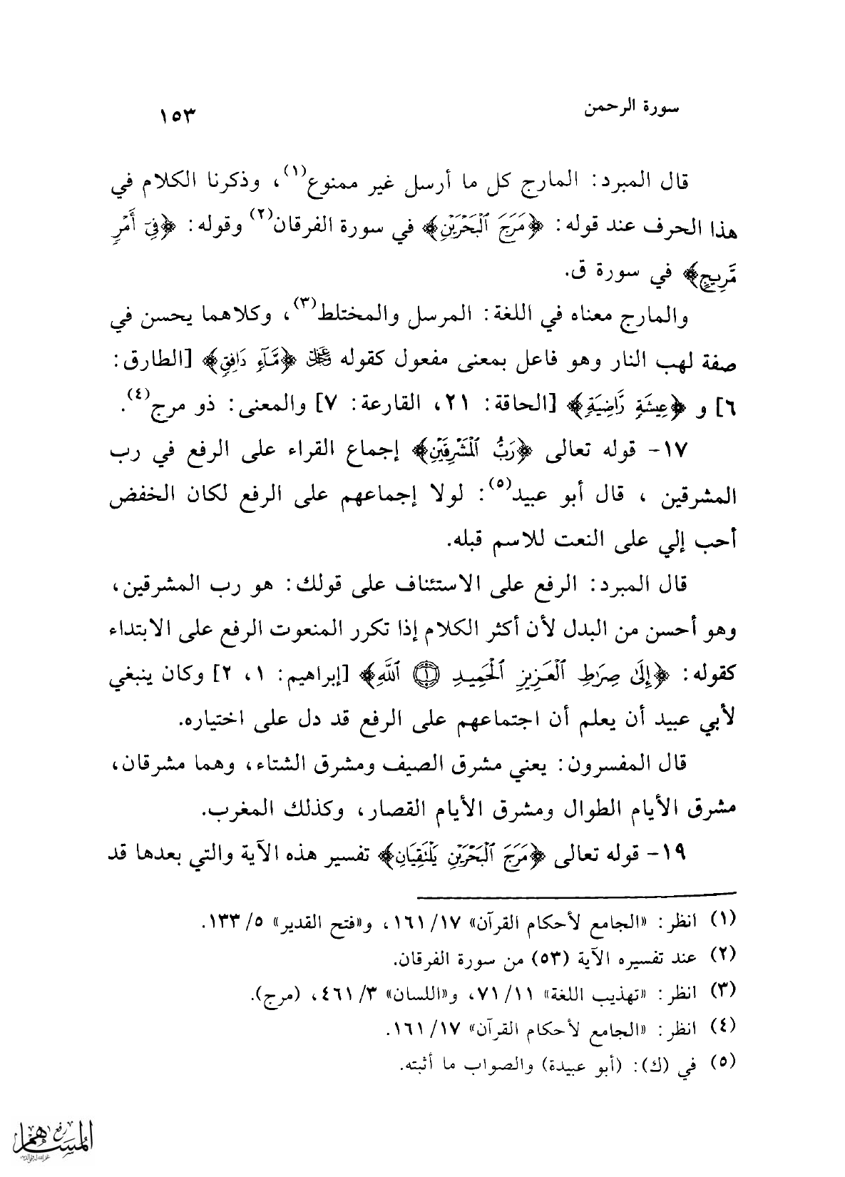 17 - قوله تعالى {رَبُّ الْمَشْرِقَيْنِ} إجماع القراء على الرفع في رب المشرقين، قال أبو عبيد (¬5): لولا إجماعهم على الرفع لكان الخفض أحب إلى على النعت للاسم قبله.