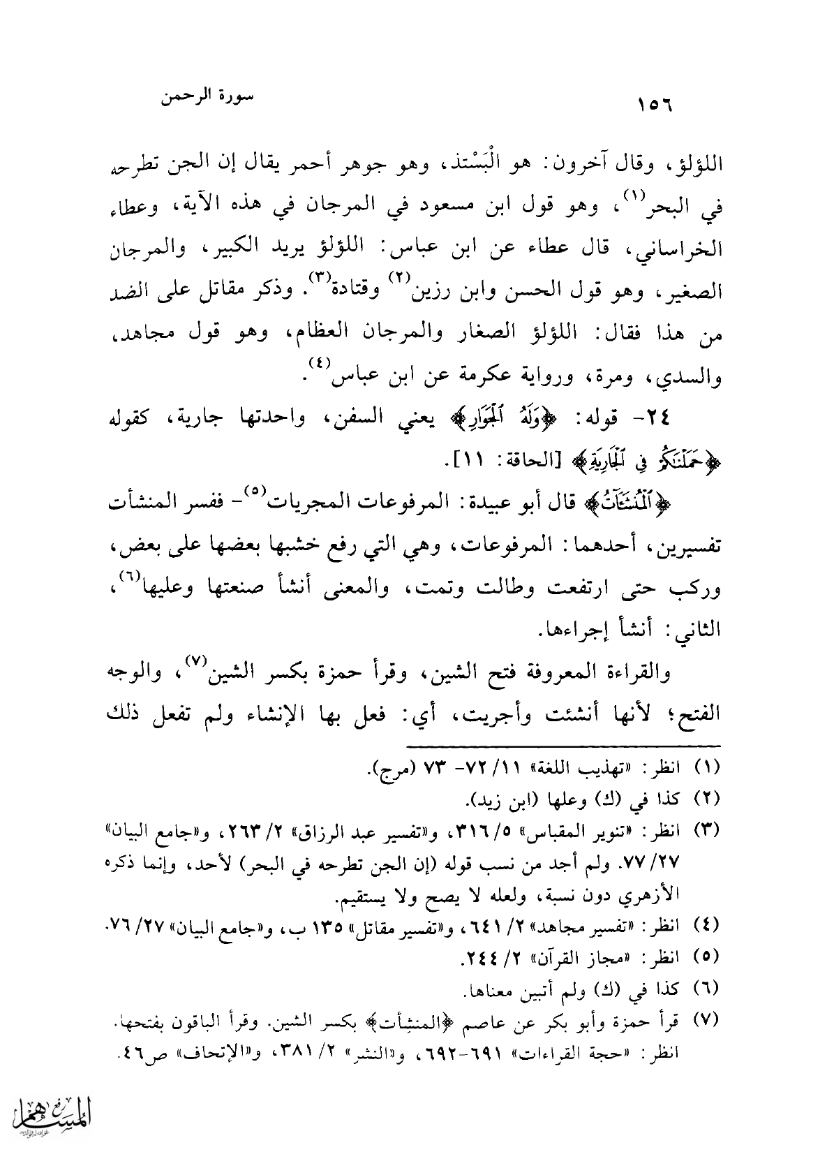 (¬7) قرأ حمزة وأبو بكر عن عاصم {المنشِآت} بكسر الشين. وقرأ الباقون بفتحها. انظر: "حجة الفراءات" 691 - 692، و"النشر" 2/ 381" و"الإتحاف" ص 46.