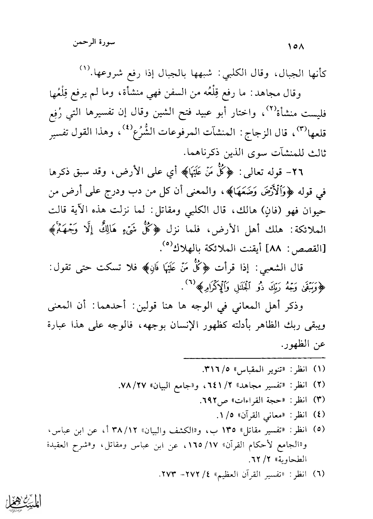 (¬5) انظر: "تفسير مقاتل" 135 ب، و"الكشف والبيان" 12/ 38 أ، عن ابن عباس، و"الجامع لأحكام القرآن" 17/ 165، عن ابن عباس ومقاتل، و"شرح العقيدة الطحاوية" 2/ 62.