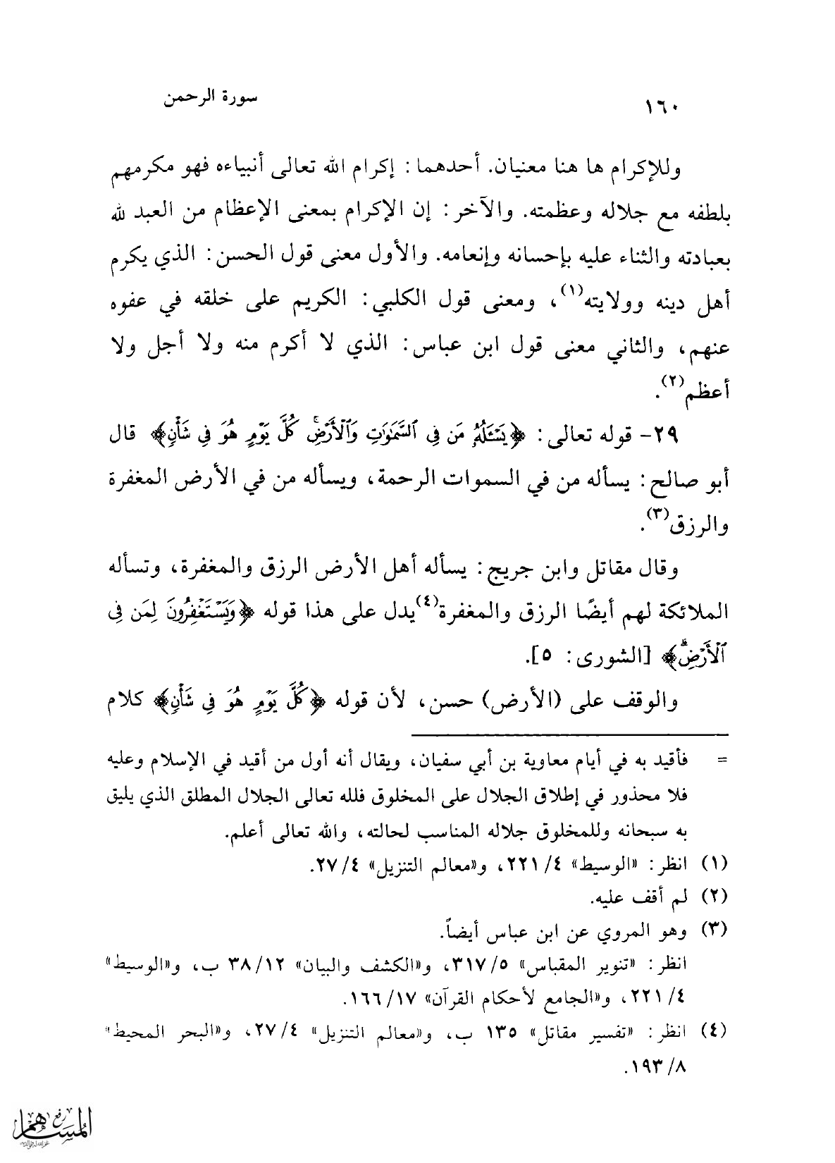29 - قوله تعالى: {يَسْأَلُهُ مَنْ فِي السَّمَاوَاتِ وَالْأَرْضِ كُلَّ يَوْمٍ هُوَ فِي شَأْنٍ} قال أبو صالح: يسأله من في السموات الرحمة، ويسأله من في الأرض المغفرة والرزق (¬3).