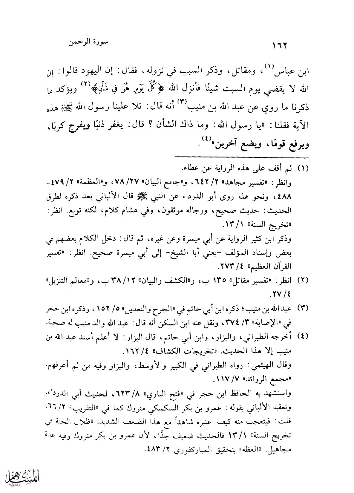 وانظر: "تفسير مجاهد" 2/ 642، و"جامع البيان" 27/ 78، و"العظمة" 2/ 479 - 488، ونحو هذا روى أبو الدرداء عن النبي في -صلى الله عليه وسلم- قال الألباني بعد ذكره لطرق الحديث: حديث صحيح، ورجاله موثقون، وفي هشام كلام، لكنه توبع. انظر: "تخريج السنة" 1/ 13.