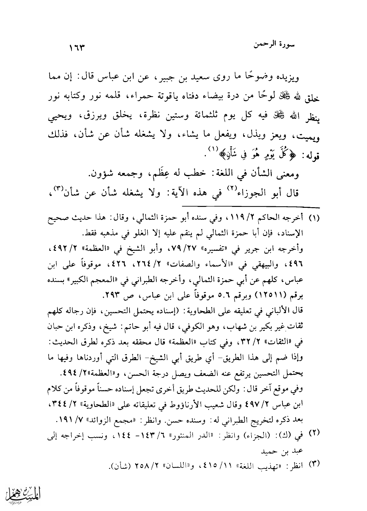 ويزيده وضوحًا ما روى سعيد بن جبير، عن ابن عباس قال: إن مما خلق لله -عز وجل- لوحًا من درة بيضاء دفتاه ياقوتة حمراء، قلمه نور وكتابه نور ينظر الله -عز وجل- فيه كل يوم ثلثمائة وستين نظرة، يخلق ويرزق، ويحيي ويميت، ويعز ويذل، ويفعل ما يشاء، ولا يشغله شأن عن شأن، فذلك قوله: {كُلَّ يَوْمٍ هُوَ فِي شَأْنٍ} (¬1).
