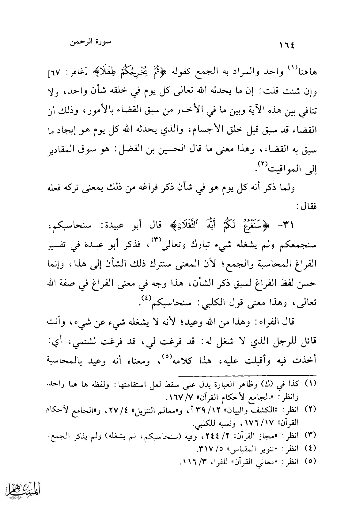 31 - {سَنَفْرُغُ لَكُمْ أَيُّهَ الثَّقَلَانِ} قال أبو عبيدة: سنحاسبكم، سنجمعكم ولم يشغله شيء تبارك وتعالى (¬3)، فذكر أبو عبيدة في تفسير الفراغ المحاسبة والجمع؛ لأن المعنى سنترك ذلك الشأن إلى هذا، وإنما حسن لفظ الفراغ لسبق ذكر الشأن، هذا وجه في معنى الفراغ في صفة الله تعالى، وهذا معنى قول الكلبي: سنحاسبكم (¬4).