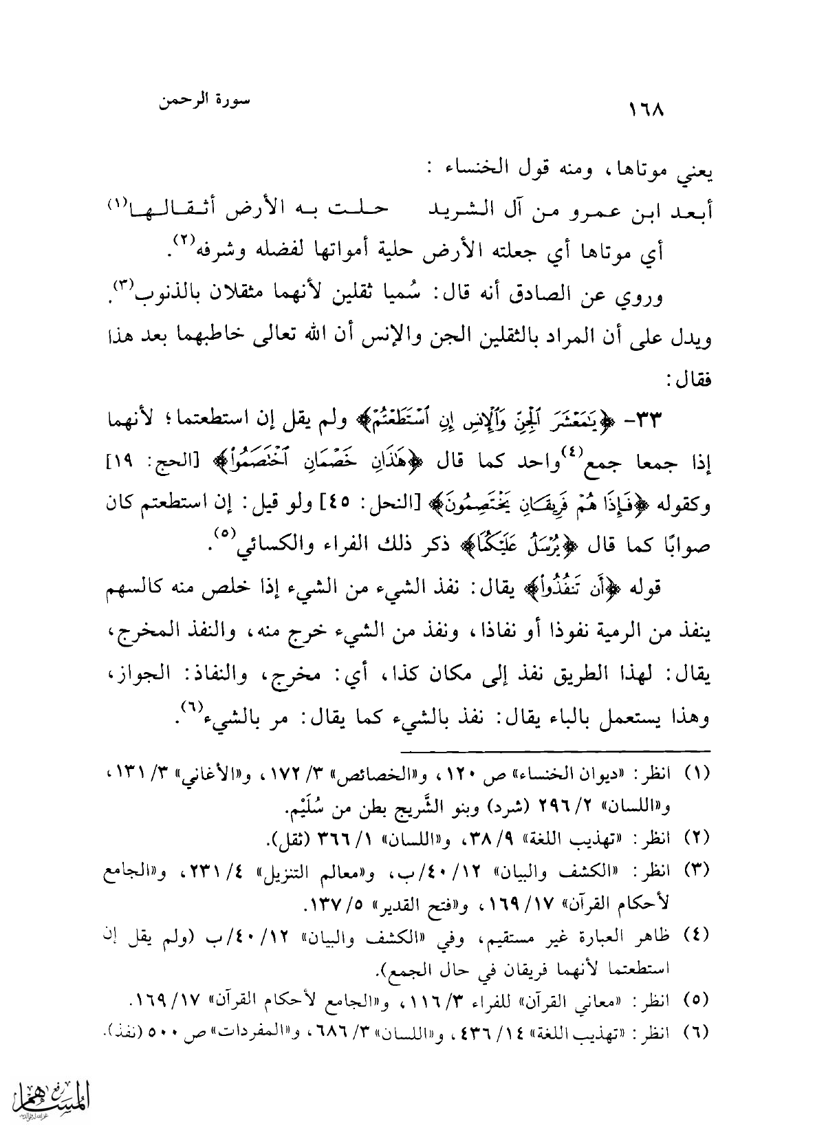 33 - {يَا مَعْشَرَ الْجِنِّ وَالْإِنْسِ إِنِ اسْتَطَعْتُمْ} ولم يقل إن استطعتما؛ لأنهما إذا جمعا جمع (¬4) واحد كما قال {هَذَانِ خَصْمَانِ اخْتَصَمُوا} [الحج: 19] وكقوله {فَإِذَا هُمْ فَرِيقَانِ يَخْتَصِمُونَ} [النحل: 45] ولو قيل: إن استطعتم كان صوابًا كما قال {يُرْسَلُ عَلَيْكُمَا} ذكر ذلك الفراء والكسائي (¬5).