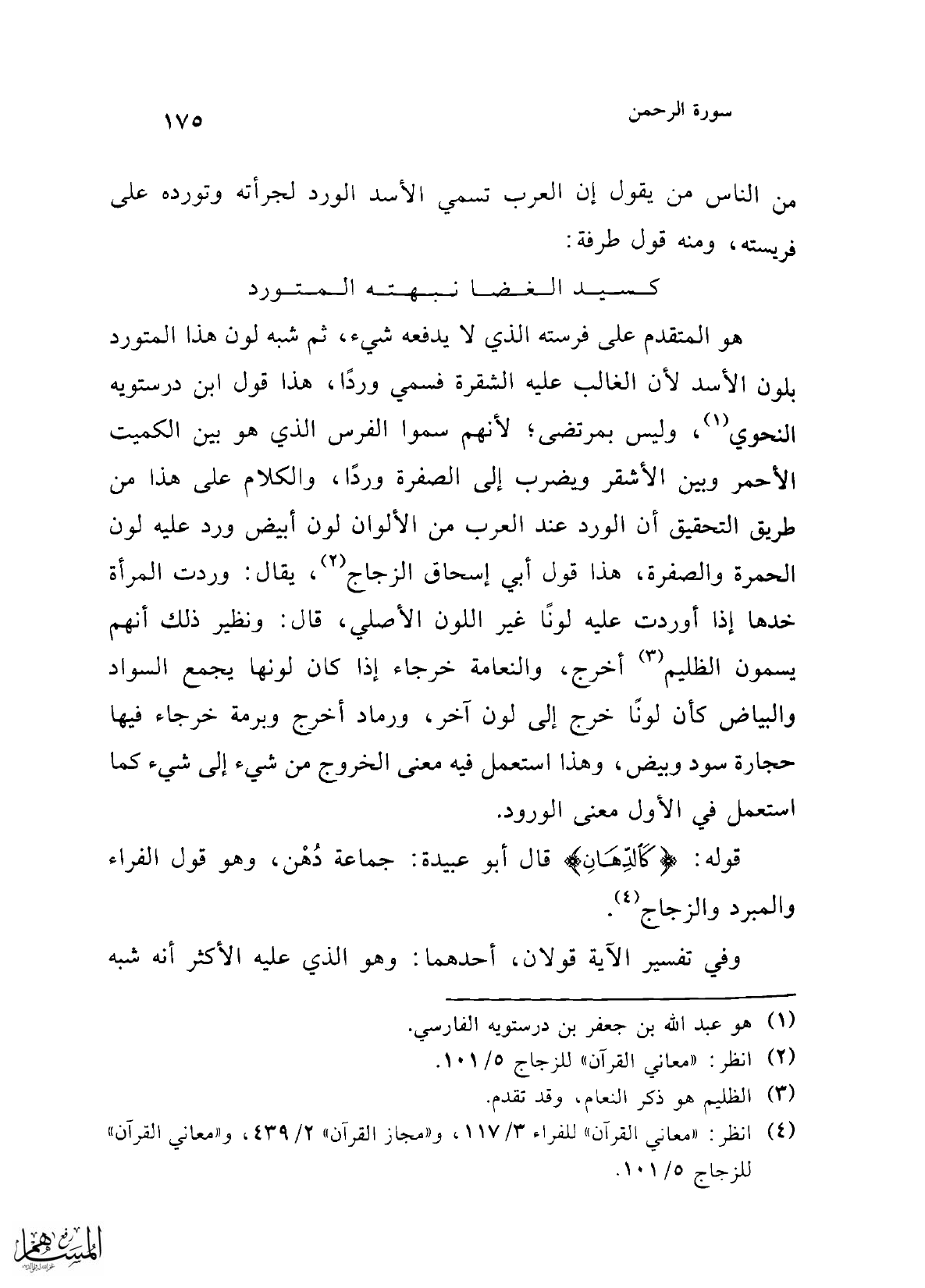 هو المتقدم على فرسته الذي لا يدفعه شيء، ثم شبه لون هذا المتورد بلون الأسد لأن الغالب عليه الشقرة فسمي وردًا، هذا قول ابن درستويه النحوي (¬1)، وليس بمرتضى؛ لأنهم سموا الفرس الذي هو بين الكميت الأحمر وبين الأشقر ويضرب إلى الصفرة وردًا، والكلام على هذا من طريق التحقيق أن الورد عند العرب من الألوان لون أبيض ورد عليه لون الحمرة والصفرة، هذا قول أبي إسحاق الزجاج (¬2)، يقال: وردت المرأة خدها إذا أوردت عليه لونًا غير اللون الأصلي، قال: ونظير ذلك أنهم يسمون الظليم (¬3) أخرج، والنعامة خرجاء إذا كان لونها يجمع السواد والبياض كأن لونًا خرج إلى لون آخر، ورماد أخرج وبرمة خرجاء فيها حجارة سود وبيض، وهذا استعمل فيه معنى الخروج من شيء إلى شيء كما استعمل في الأول معنى الورود.
