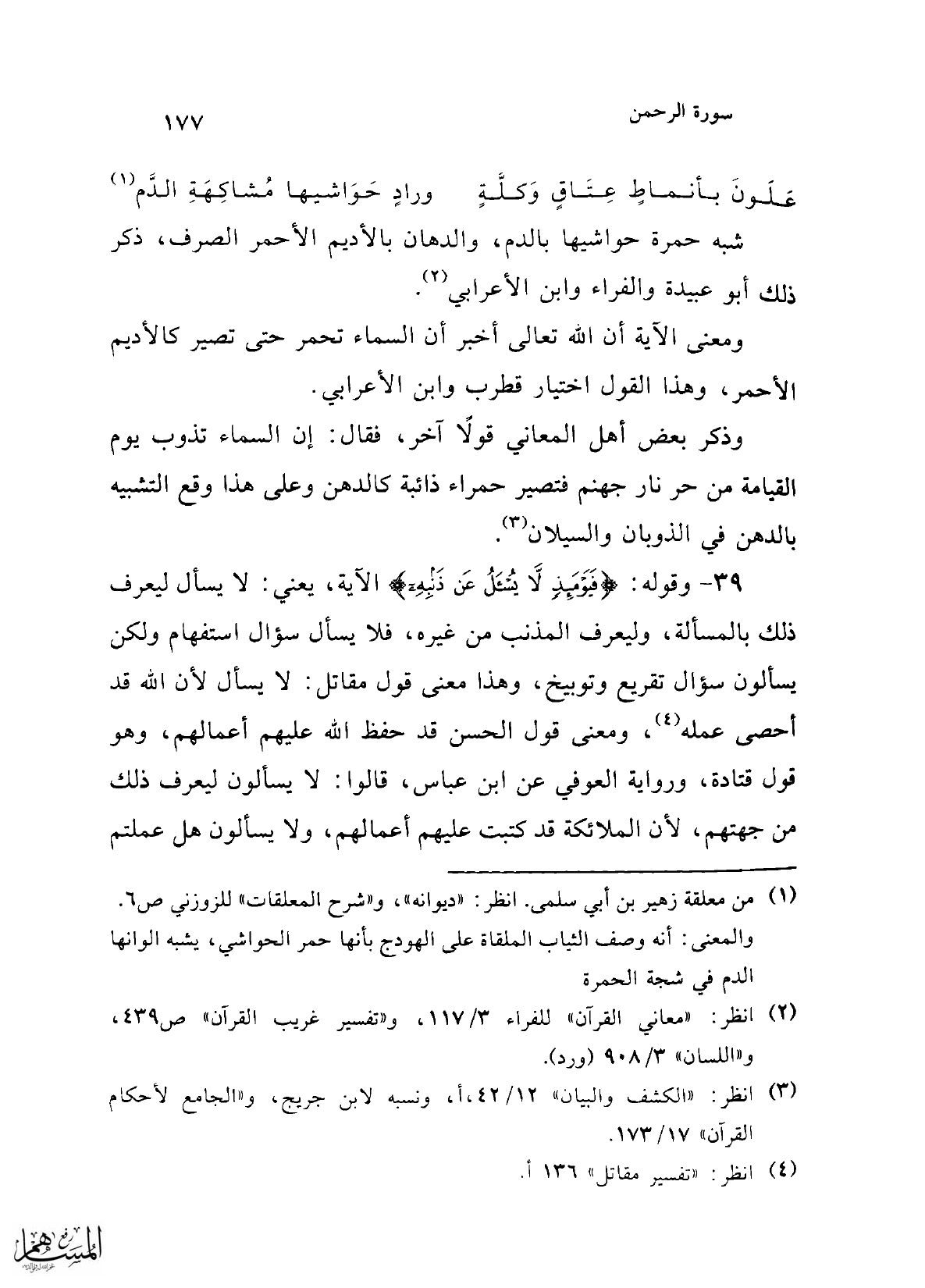 39 - وقوله: {فَيَوْمَئِذٍ لَا يُسْأَلُ عَنْ ذَنْبِهِ} الآية، يعني: لا يسأل ليعرف ذلك بالمسألة، وليعرف المذنب من غيره، فلا يسأل سؤال إستفهام ولكن يسألون سؤال تقريع وتوبيخ، وهذا معنى قول مقاتل: لا يسأل لأن الله قد أحصى عمله (¬4)، ومعنى قول الحسن قد حفظ الله عليهم أعمالهم، وهو قول قتادة، ورواية العوفي عن ابن عباس، قالوا: لا يسألون ليعرف ذلك من جهتهم، لأن الملائكة قد كتبت عليهم أعمالهم، ولا يسألون هل عملتم