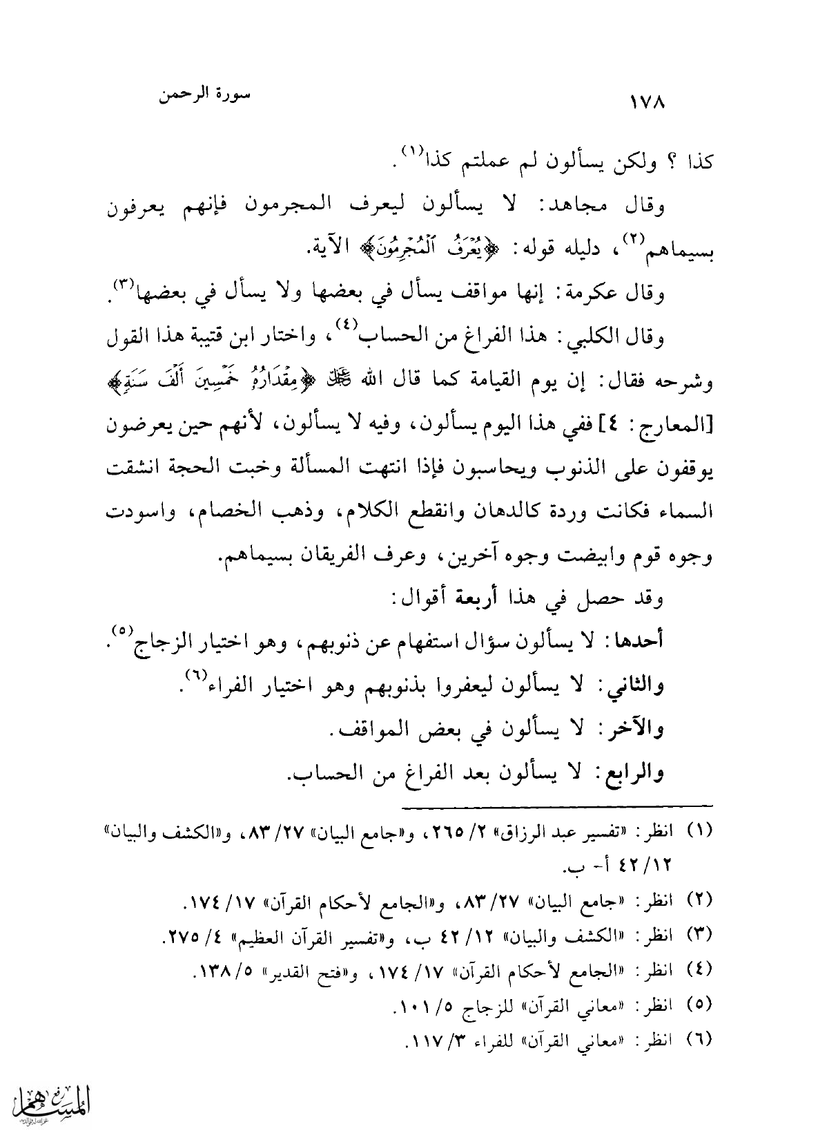 وقال مجاهد: لا يسألون ليعرف المجرمون فإنهم يعرفون بسيماهم (¬2)، دليله قوله: {يُعْرَفُ الْمُجْرِمُونَ} الآية.
