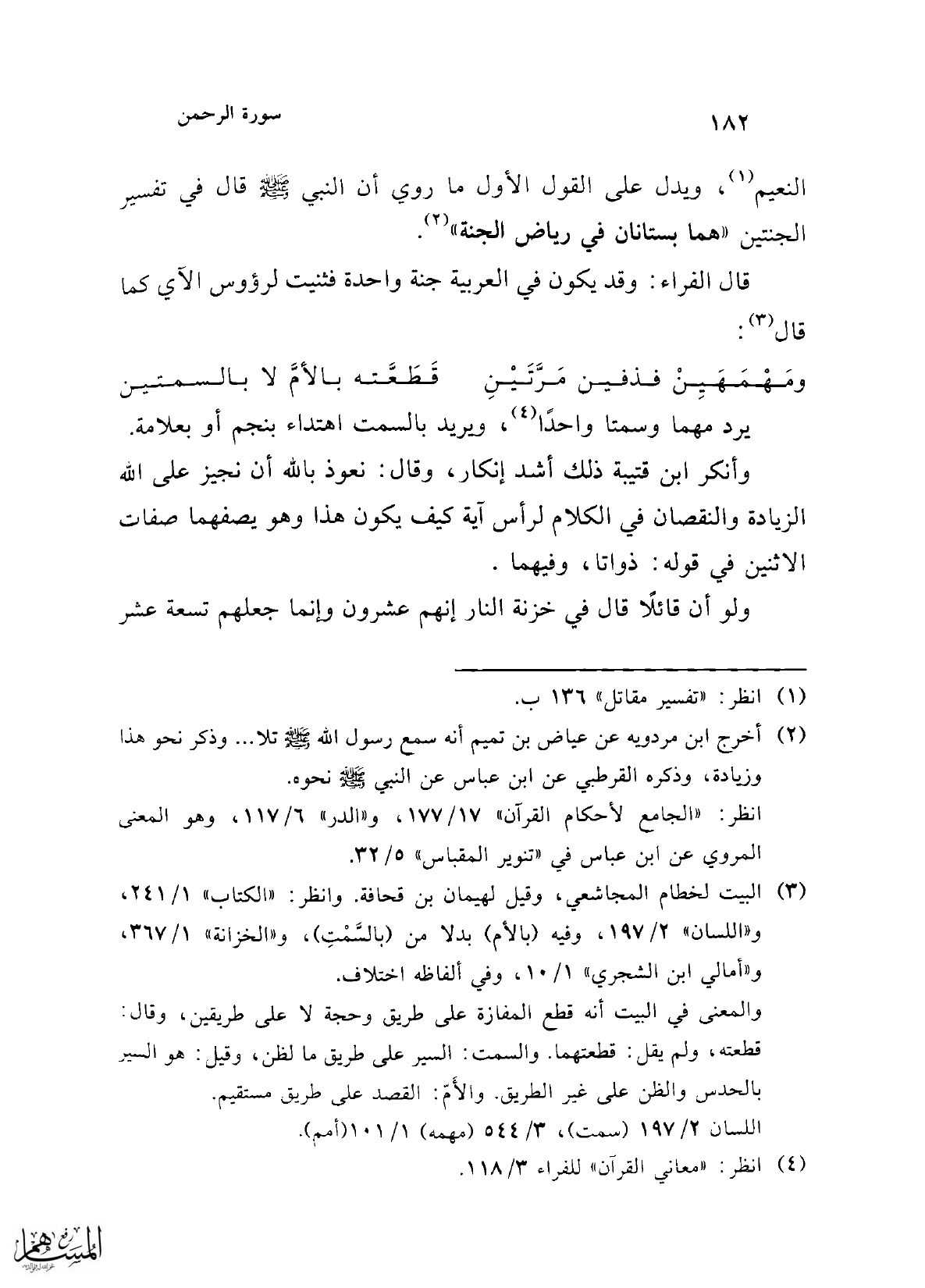 وأنكر ابن قتيبة ذلك أشد إنكار، وقال: نعوذ بالله أن نجيز على الله الزيادة والنقصان في الكلام لرأس آية كيف يكون هذا وهو يصفهما صفات الاثنين في قوله: ذواتا، وفيهما.