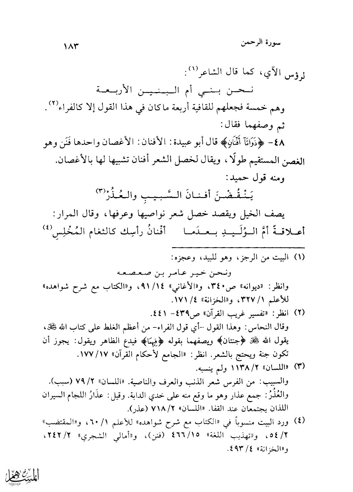 48 - {ذَوَاتَا أَفْنَانٍ} قال أبو عبيدة: الأفنان: الأغصان واحدها فَنَن وهو الغصن المستقيم طولًا، ويقال لخصل الشعر أفنان تشبيها لها بالأغصان.