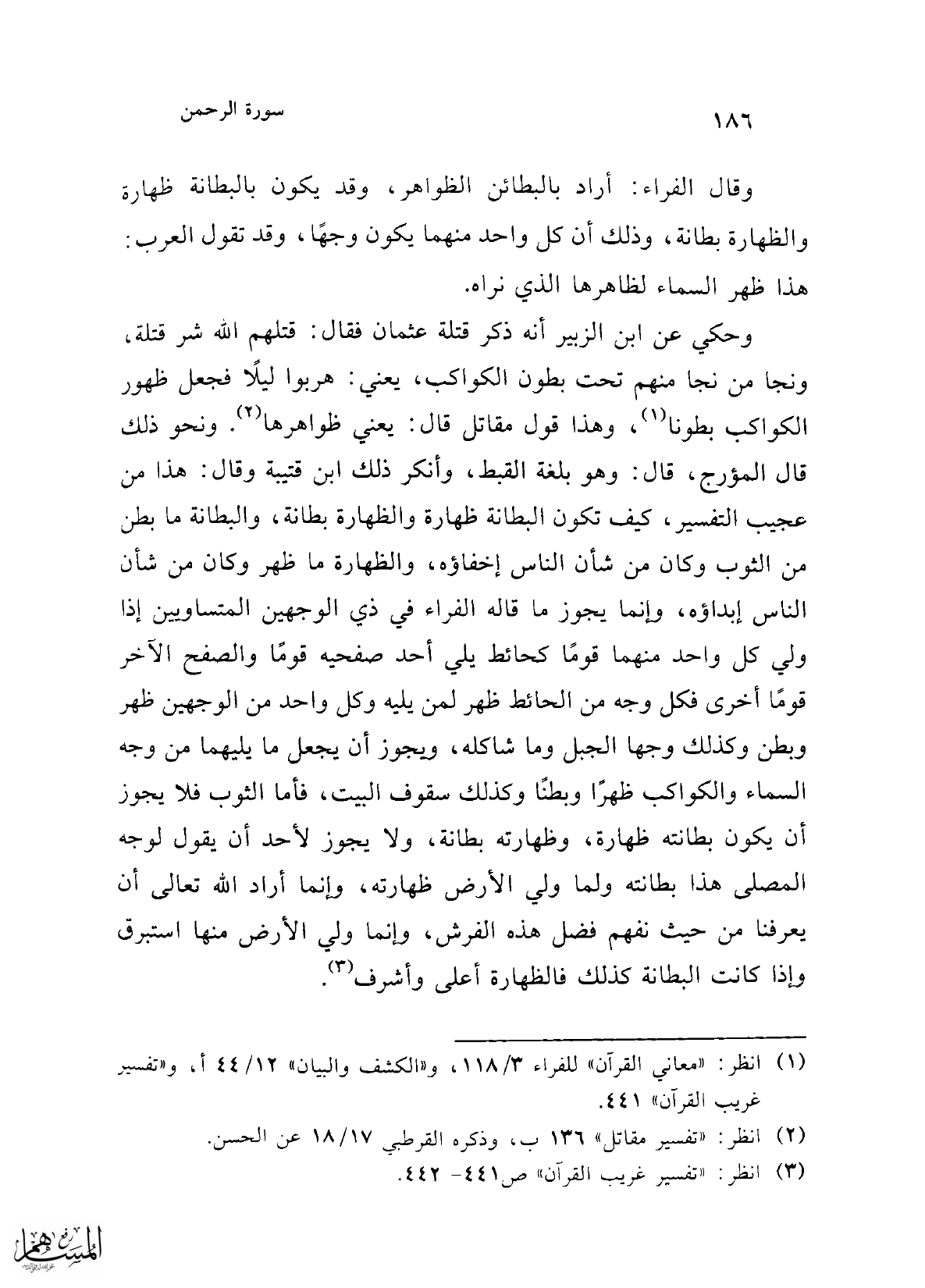 وحكي عن ابن الزبير أنه ذكر قتلة عثمان فقال: قتلهم الله شر قتلة، ونجا من نجا منهم تحت بطون الكواكب، يعني: هربوا ليلًا فجعل ظهور الكواكب بطونا (¬1)، وهذا قول مقاتل قال: يعني ظواهرها (¬2). ونحو ذلك قال المؤرج، قال: وهو بلغة القبط، وأنكر ذلك ابن قتيبة وقال: هذا من عجيب التفسير، كيف تكون البطانة ظهارة والطهارة بطانة، والبطانة ما بطن من الثوب وكان من شأن الناس إخفاؤه، والظهارة ما ظهر وكان من شأن الناس إبداؤه، وإنما يجوز ما قاله الفراء في ذي الوجهين المتساويين إذا ولي كل واحد منهما قومًا كحائط يلي أحد صفحيه قومًا والصفح الآخر قومًا أخرى فكل وجه من الحائط ظهر لمن يليه وكل واحد من الوجهين ظهر وبطن وكذلك وجها الجبل وما شاكله، ويجوز أن يجعل ما يليهما من وجه السماء والكواكب ظهرًا وبطنًا وكذلك سقوف البيت، فأما الثوب فلا يجوز أن يكون بطانته ظهارة، وظهارته بطانة، ولا يجوز لأحد أن يقول لوجه المصلى هذا بطانته ولما ولي الأرض ظهارته، وإنما أراد الله تعالى أن يعرفنا من حيث نفهم فضل هذه الفرش، وإنما ولي الأرض منها استبرق وإذا كانت البطانة كذلك فالظهارة أعلى وأشرف (¬3).