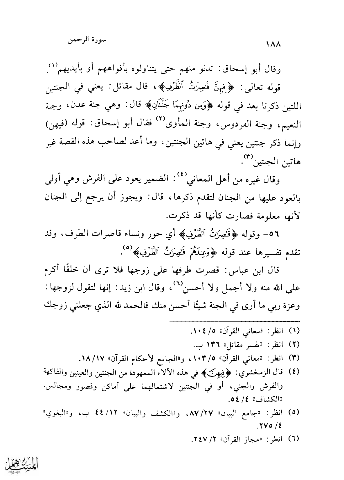 قوله تعالى: {فِيهِنَّ قَاصِرَاتُ الطَّرْفِ}، قال مقاتل: يعني في الجنتين اللتين ذكرتا بعد في قوله {وَمِنْ دُونِهِمَا جَنَّتَانِ} قال: وهي جنة عدن، وجنة النعيم، وجنة الفردوس، وجنة المأوى (¬2) فقال أبو إسحاق: قوله (فيهن) وإنما ذكر جنتين يعني في هاتين الجنتين، وما أعد لصاحب هذه القصة غير هاتين الجنتين (¬3).