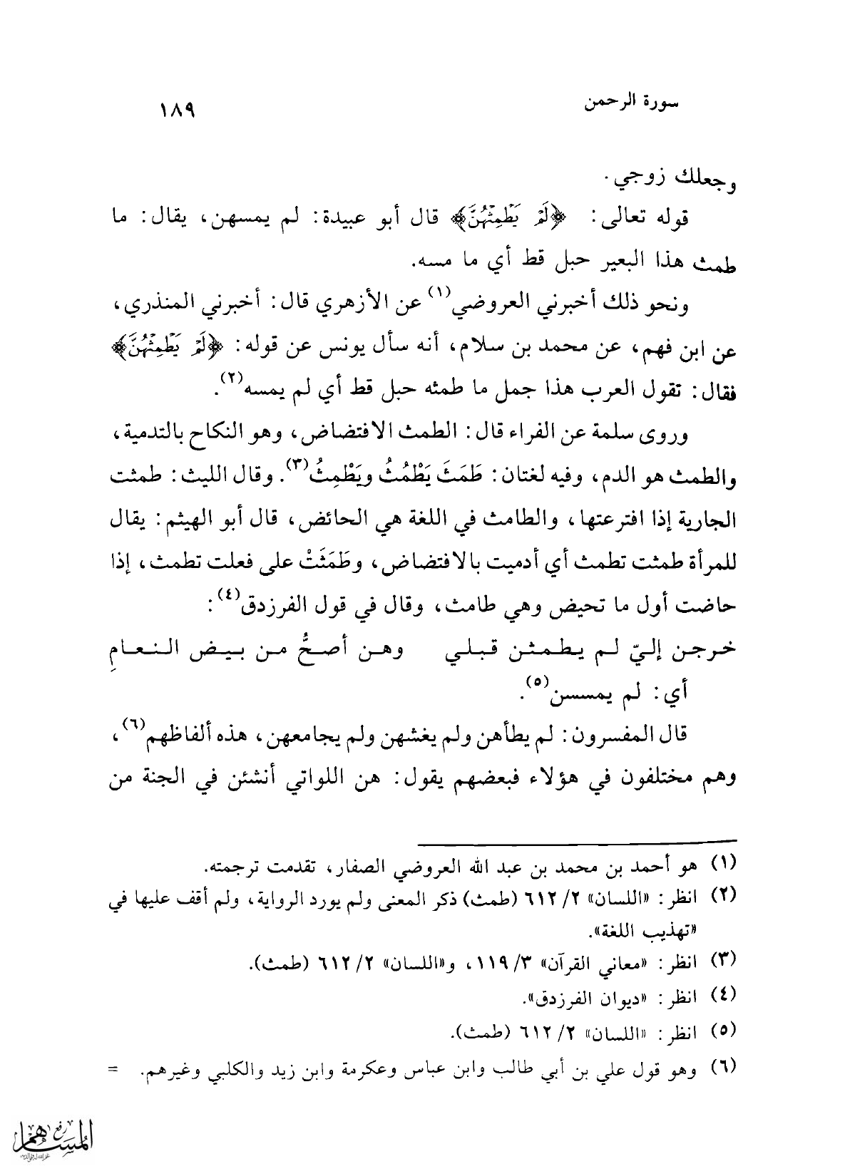 ونحو ذلك أخبرني العروضي (¬1) عن الأزهري قال: أخبرني المنذري، عن ابن فهم، عن محمد بن سلام، أنه سأل يونس عن قوله: {لَمْ يَطْمِثْهُنَّ} فقال: تقول العرب هذا جمل ما طمثه حبل قط أي لم يمسه (¬2).