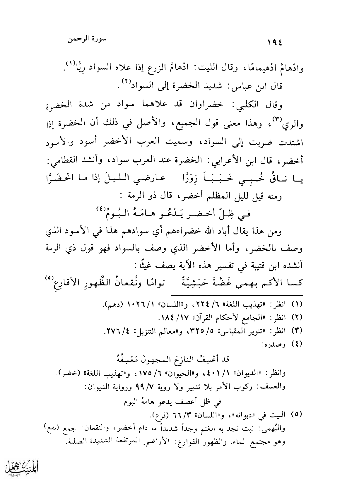 وقال الكلبي: خضراوان قد علاهما سواد من شدة الخضرة والري (¬3)، وهذا معنى قول الجميع، والأصل في ذلك أن الخضرة إذا اشتدت ضربت إلى السواد، وسميت العرب الأخضر أسود والأسود أخضر، قال ابن الأعرابي: الخضرة عند العرب سواد، وأنشد القطامي: