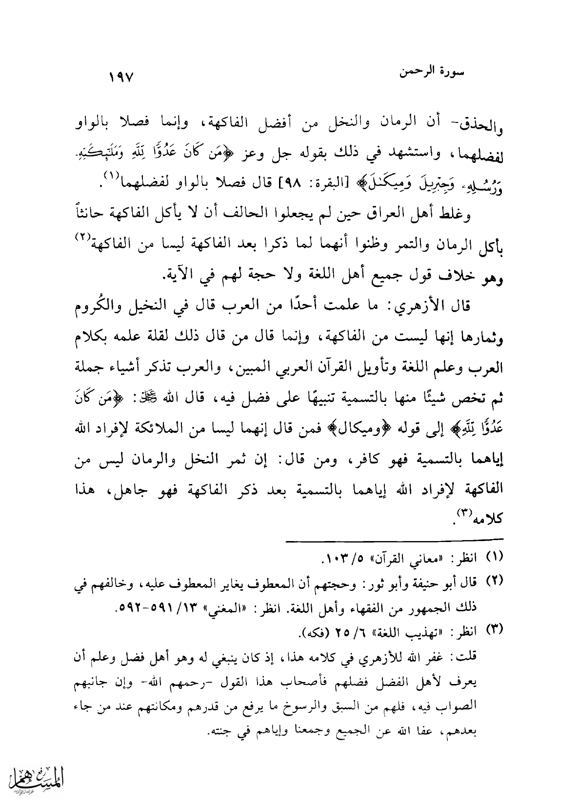 قال الأزهري: ما علمت أحدًا من العرب قال في النخيل والكُروم وثمارها إنها ليست من الفاكهة، وإنما قال من قال ذلك لقلة علمه بكلام العرب وعلم اللغة وتأويل القرآن العربي المبين، والعرب تذكر أشياء جملة ثم تخص شيئًا منها بالتسمية تنبيهًا على فضل فيه، قال الله -عز وجل-: {مَنْ كَانَ عَدُوًّا لِلَّهِ} إلى قوله {وَمِيكَالَ} فمن قال إنهما ليسا من الملائكة لإفراد الله إياهما بالتسمية فهو كافر، ومن قال: إن ثمر النخل والرمان ليس من الفاكهة لإفراد الله إياهما بالتسمية بعد ذكر الفاكهة فهو جاهل، هذا كلامه (¬3).