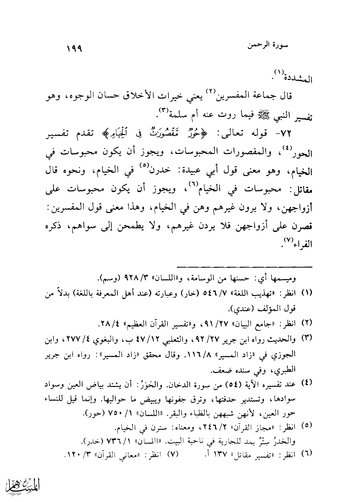 72 - قوله تعالى: {حُورٌ مَقْصُورَاتٌ فِي الْخِيَامِ} تقدم تفسير الحور (¬4)، والمقصورات المحبوسات، ويجوز أن يكون محبوسات في الخيام، وهو معنى قول أبي عبيدة: خدرن (¬5) في الخيام، ونحوه قال مقاتل: محبوسات في الخيام (¬6)، ويجوز أن يكون محبوسات على أزواجهن، ولا يرون غيرهم وهن في الخيام، وهذا معنى قول المفسرين: قصرن على أزواجهن فلا يردن غيرهم، ولا يطمحن إلى سواهم، ذكره الفراء (¬7).