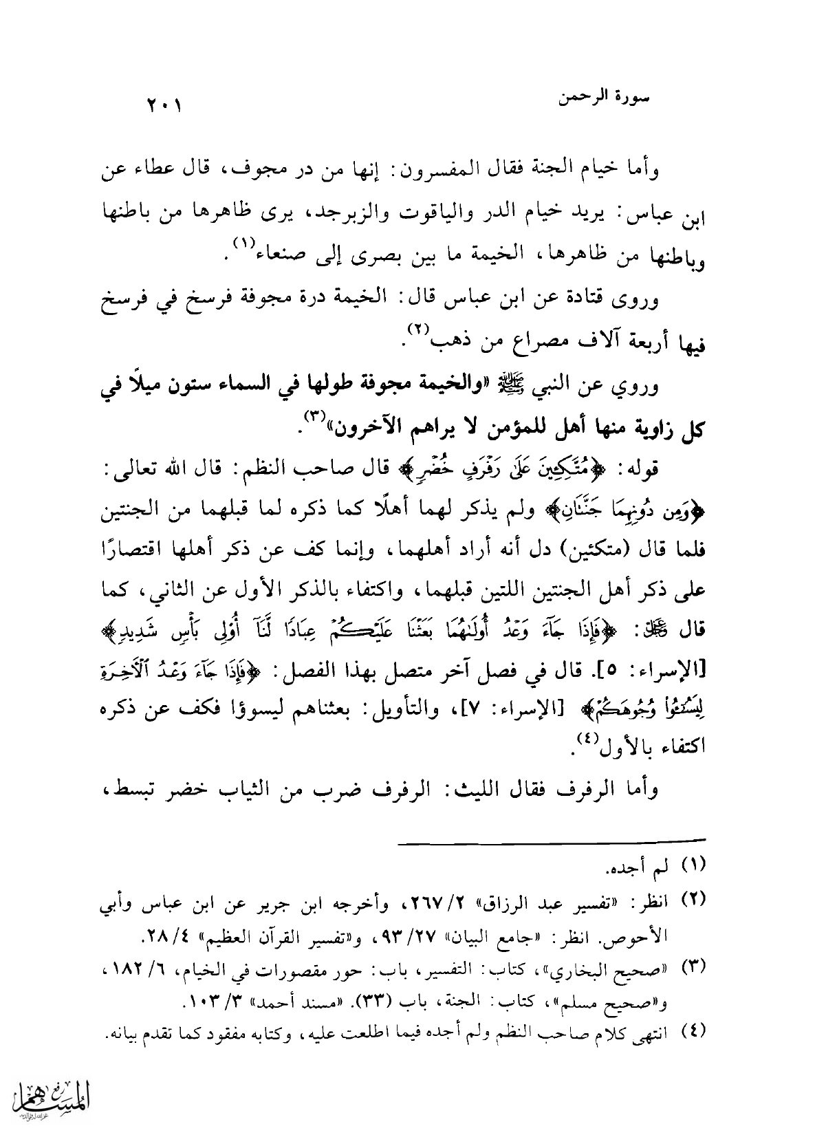 (¬3) "صحيح البخاري"، كتاب: التفسير، باب: حور مقصورات في الخيام، 6/ 182، و"صحيح مسلم"، كتاب: الجنة، باب (33). "مسند أحمد" 3/ 103.