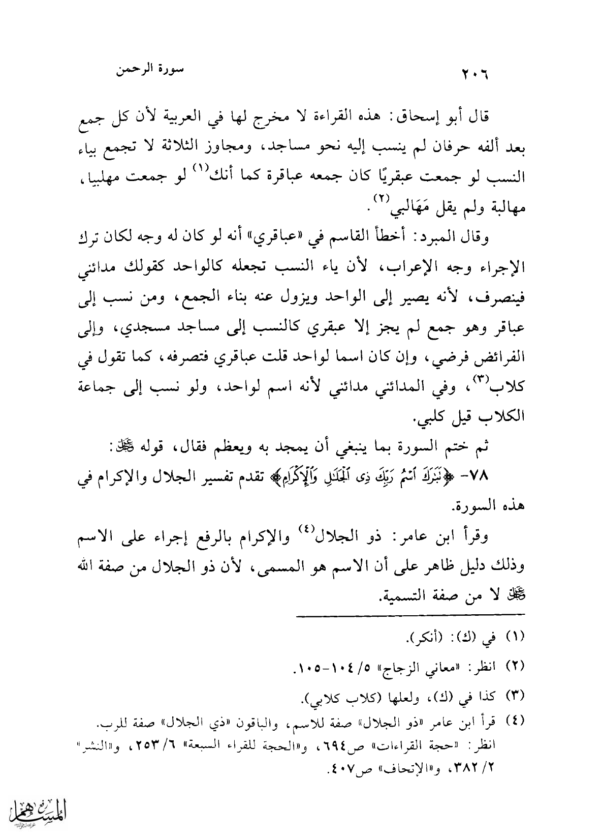 قال أبو إسحاق: هذه القراءة لا مخرج لها في العربية لأن كل جمع بعد ألفه حرفان لم ينسب إليه نحو مساجد، ومجاوز الثلاثة لا تجمع بياء النسب لو جمعت عبقريًا كان جمعه عباقرة كما أنك (¬1) لو جمعت مهلبيا، مهالبة ولم يقل مَهَالبي (¬2).