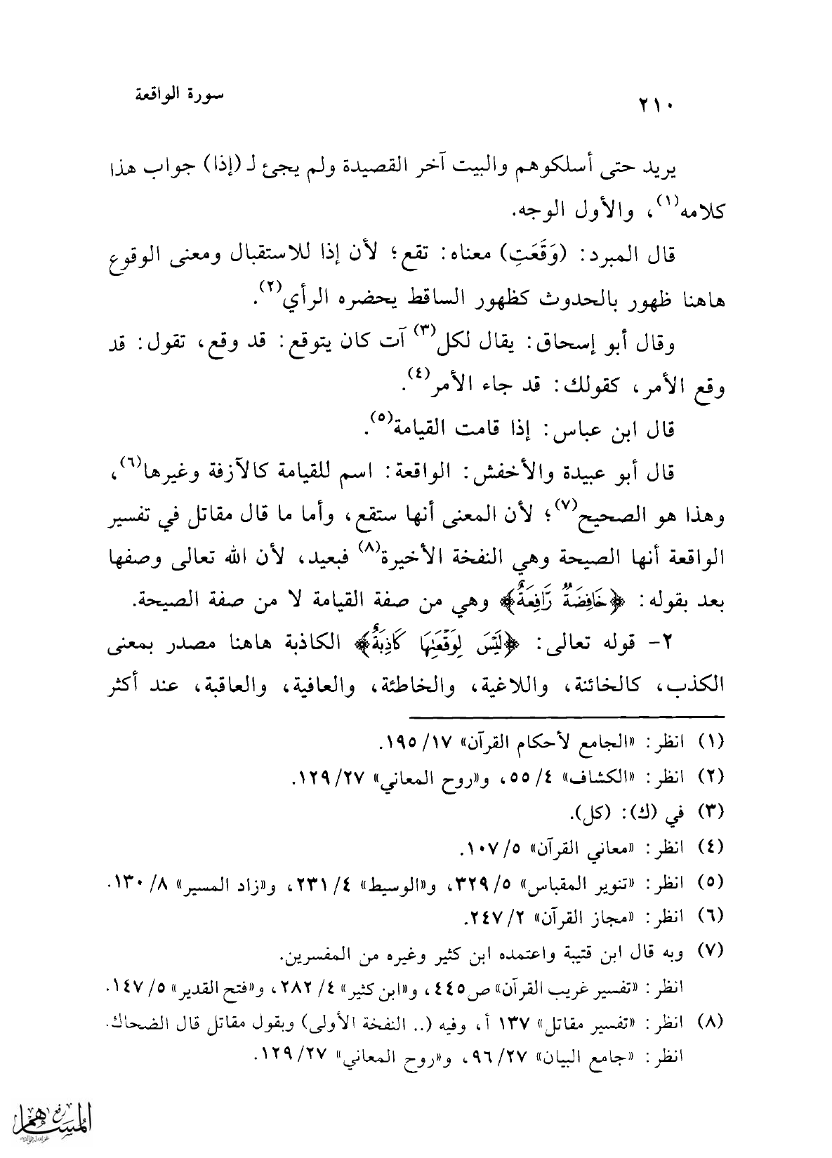 قال المبرد: (وَقَعَتِ) معناه: تقع؛ لأن إذا للاستقبال ومعنى الوقوع هاهنا ظهور بالحدوث كظهور الساقط يحضره الرأي (¬2).