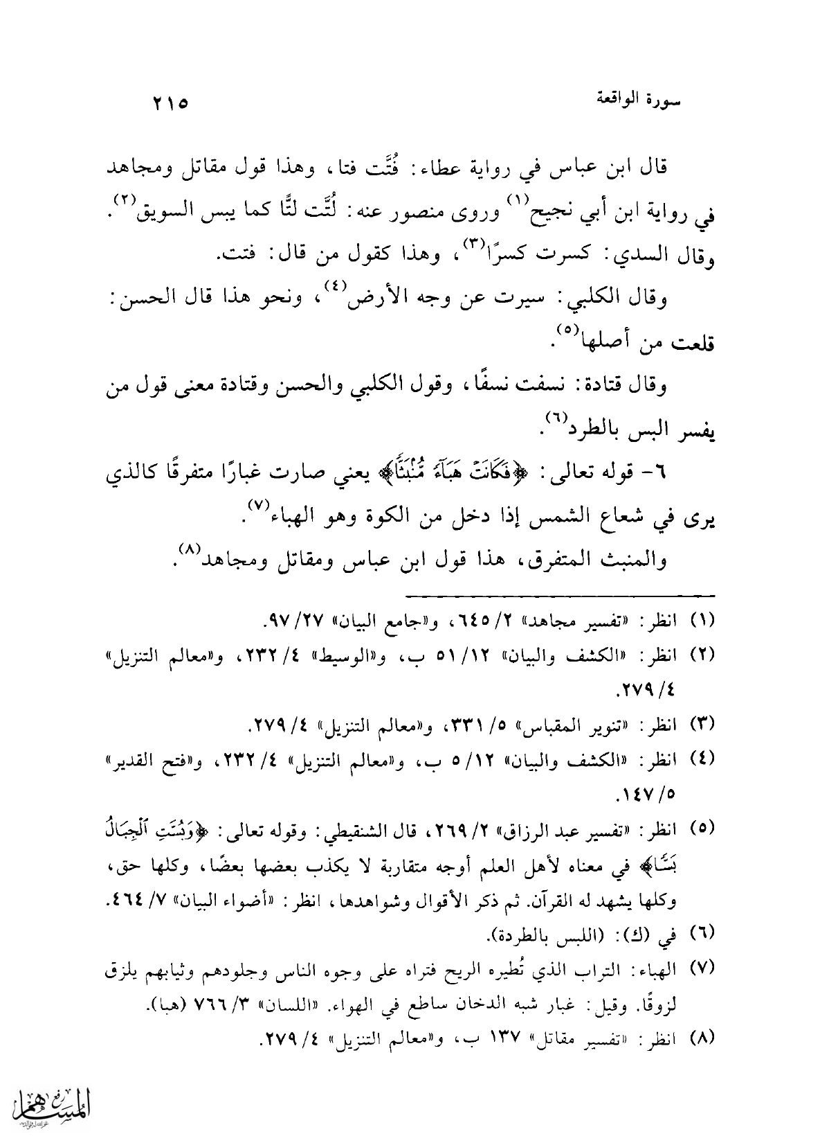 (¬5) انظر: "تفسير عبد الرزاق" 2/ 269، قال الشنقيطي: وقوله تعالى: {وَبُسَّتِ الْجِبَالُ بَسًّا} في معناه لأهل العلم أوجه متقاربة لا يكذب بعضها بعضًا، وكلها حق، وكلها يشهد له القرآن. ثم ذكر الأقوال وشواهدها، انظر: "أضواء البيان" 7/ 464.