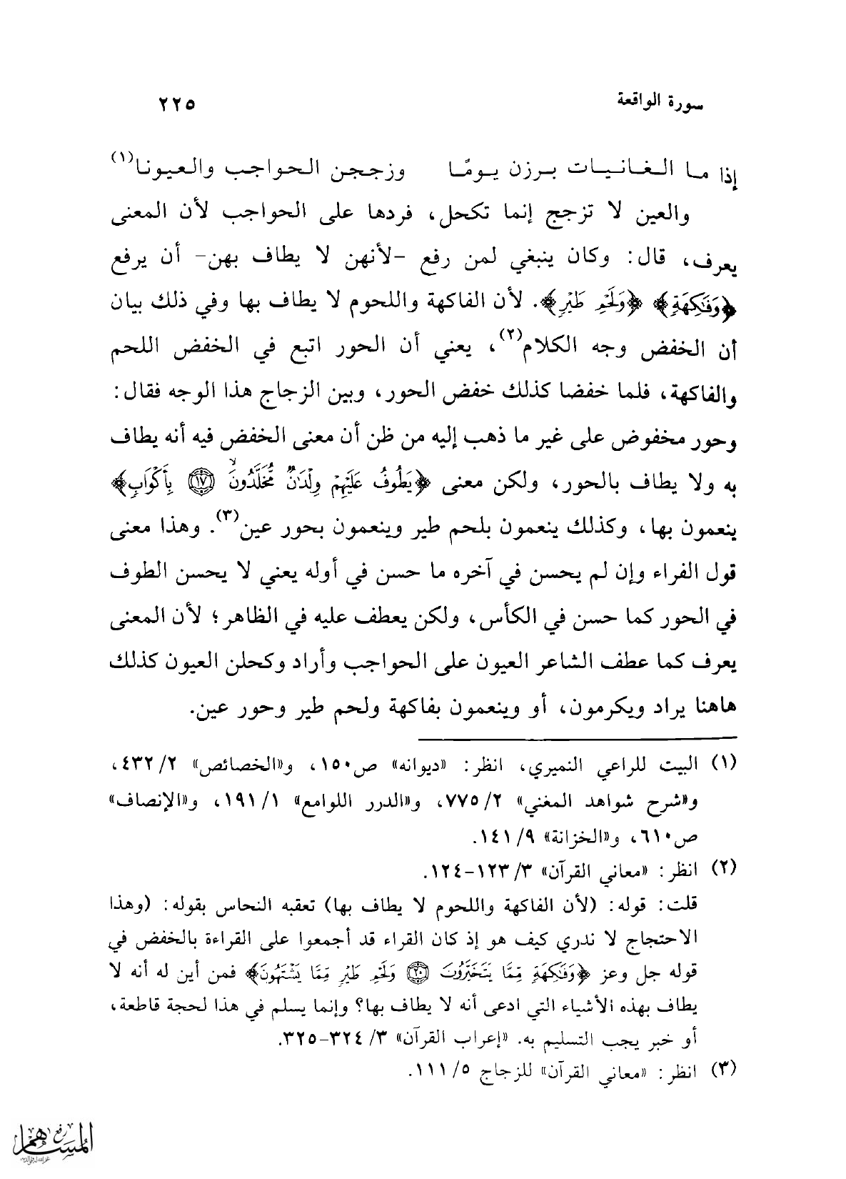 والعين لا تزجج إنما تكحل، فردها على الحواجب لأن المعنى يعرف، قال: وكان ينبغي لمن رفع -لأنهن لا يطاف بهن- أن يرفع {فَاكِهَةٍ} {وَلَحْمِ طَيْرٍ}. لأن الفاكهة واللحوم لا يطاف بها وفي ذلك بيان أن الخفض وجه الكلام (¬2)، يعني أن الحور أَتبع في الخفض اللحم والفاكهة، فلما خفضا كذلك خفض الحور، وبين الزجاج هذا الوجه فقال: وحور مخفوض على غير ما ذهب إليه من ظن أن معنى الخفض فيه أنه يطاف به ولا يطاف بالحور، ولكن معنى {يَطُوفُ عَلَيْهِمْ وِلْدَانٌ مُخَلَّدُونَ (17) بِأَكْوَابٍ} ينعمون بها، وكذلك ينعمون بلحم طير وينعمون بحور عين (¬3). وهذا معنى قول الفراء وإن لم يحسن في آخره ما حسن في أوله يعني لا يحسن الطوف في الحور كما حسن في الكأس، ولكن يعطف عليه في الظاهر؛ لأن المعنى يعرف كما عطف الشاعر العيون على الحواجب وأراد وكحلن العيون كذلك هاهنا يراد ويكرمون، أو وينعمون بفاكهة ولحم طير وحور عين.