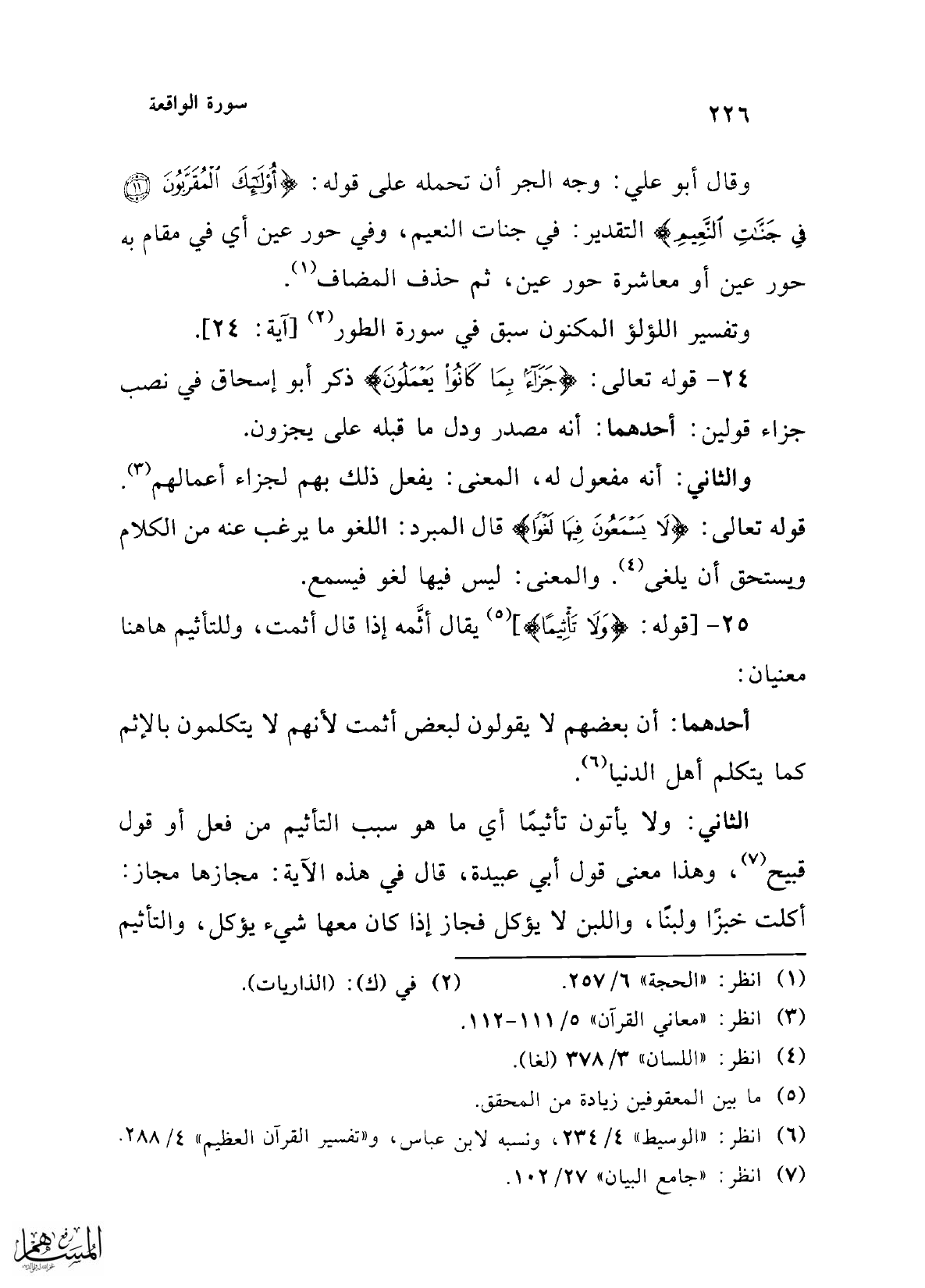 25 - [قوله: {وَلَا تَأْثِيمًا}] (¬5) يقال أثَّمه إذا قال أثمت، وللتأثيم هاهنا معنيان: