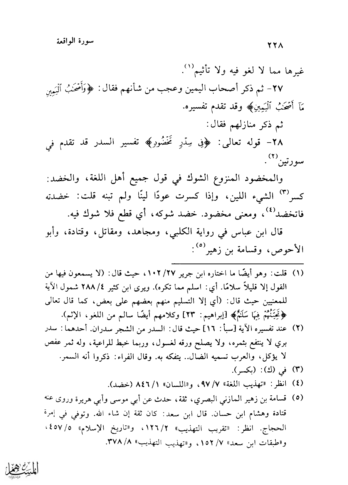 28 - قوله تعالى: {فِي سِدْرٍ مَخْضُودٍ} تفسير السدر قد تقدم في سورتين (¬2).