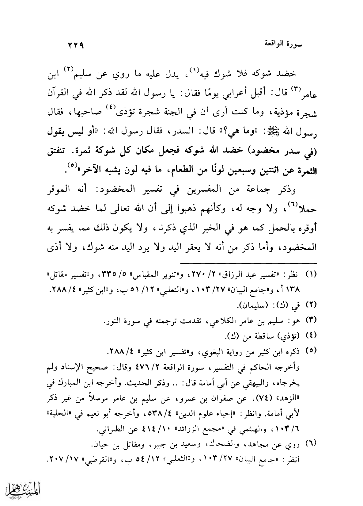 خضد شوكه فلا شوك فيه (¬1)، يدل عليه ما روي عن سليم (¬2) ابن عامر (¬3) قال: أقبل أعرابي يومًا فقال: يا رسول الله لقد ذكر الله في القرآن شجرة مؤذية، وما كنت أرى أن في الجنة شجرة تؤذى (¬4) صاحبها، فقال رسول الله -صلى الله عليه وسلم-: "وما هي؟ " قال: السدر، فقال رسول الله: "أو ليس يقول (في سدر مخضود) خضد الله شوكه فجعل مكان كل شوكة ثمرة، تنفتق الثمرة عن اثنتين وسبعين لونًا من الطعام، ما فيه لون يشبه الآخر" (¬5).