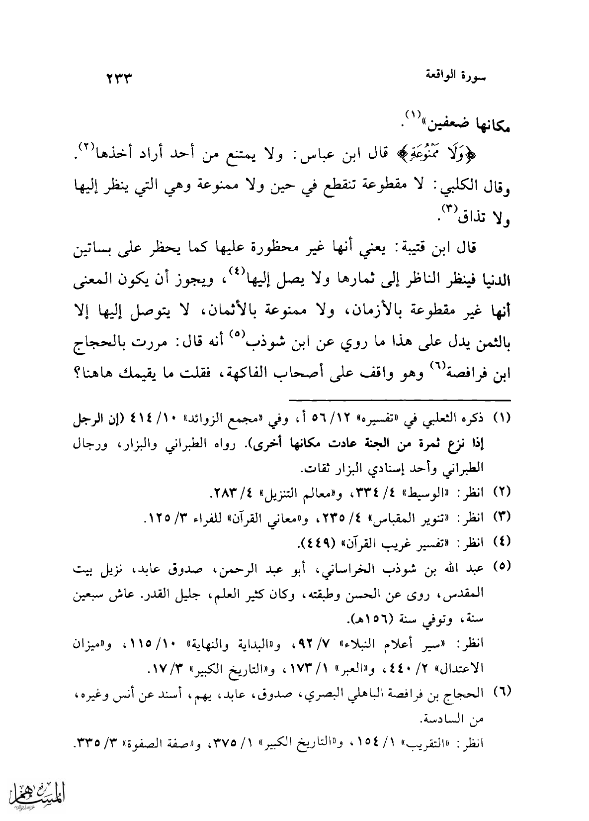 قال ابن قتيبة: يعني أنها غير محظورة عليها كما يحظر على بساتين الدنيا فينظر الناظر إلى ثمارها ولا يصل إليها (¬4)، ويجوز أن يكون المعنى أنها غير مقطوعة بالأزمان، ولا ممنوعة بالأثمان، لا يتوصل إليها إلا بالثمن يدل على هذا ما روي عن ابن شوذب (¬5) أنه قال: مررت بالحجاج ابن فرافصة (¬6) وهو واقف على أصحاب الفاكهة، فقلت ما يقيمك هاهنا؟