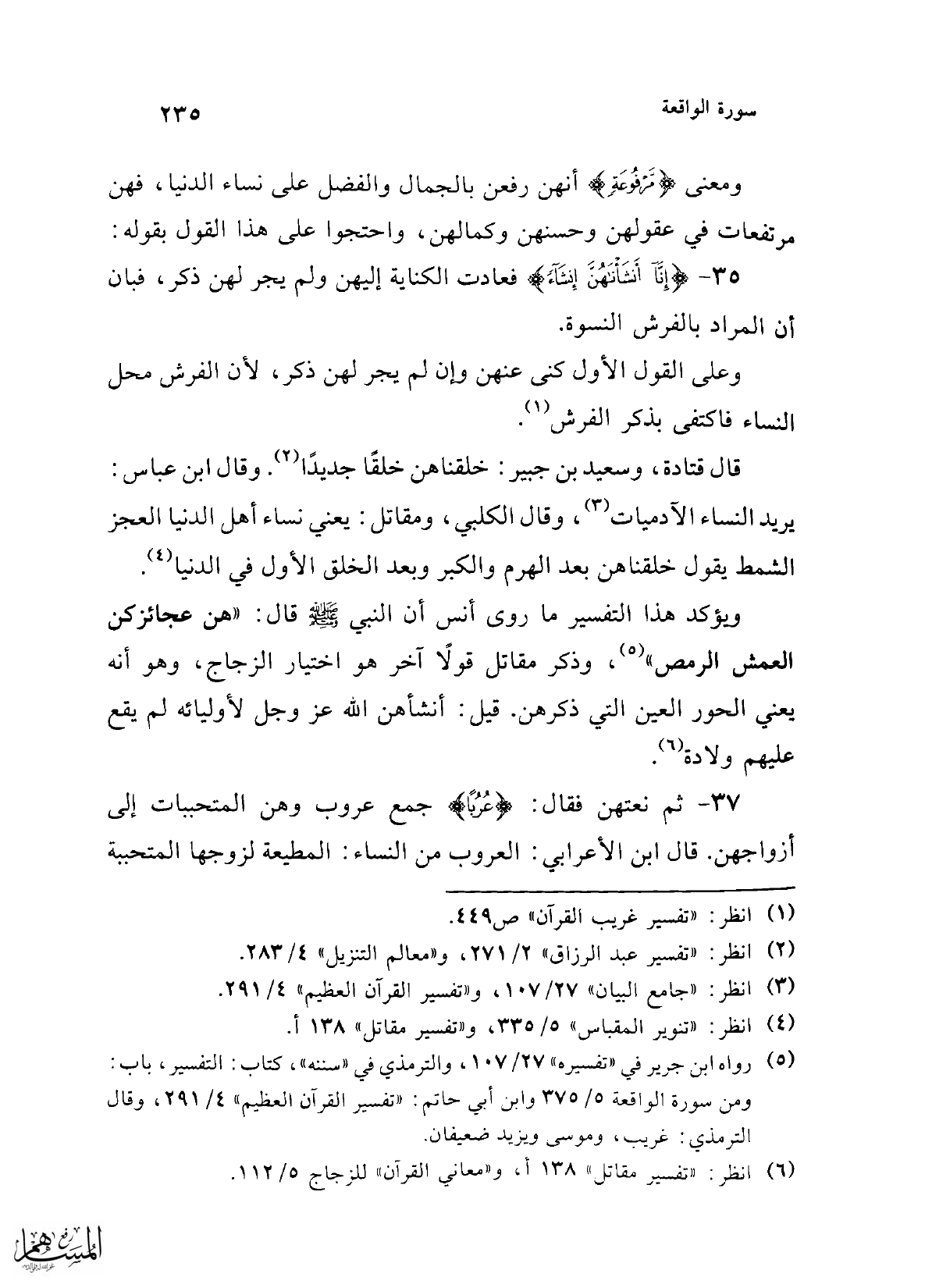 37 - ثم نعتهن فقال: {عُرُبًا} جمع عروب وهن المتحببات إلى أزواجهن. قال ابن الأعرابي: العروب من النساء: المطيعة لزوجها المتحببة