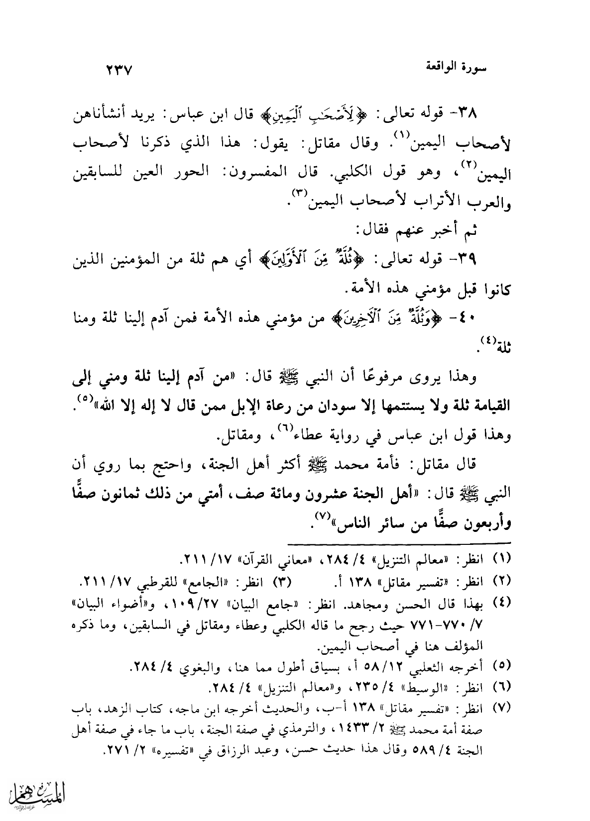 قال مقاتل: فأمة محمد -صلى الله عليه وسلم- أكثر أهل الجنة، واحتج بما روي أن النبي -صلى الله عليه وسلم- قال: "أهل الجنة عشرون ومائة صف، أمتي من ذلك ثمانون صفًّا وأربعون صفًّا من سائر الناس" (¬7).