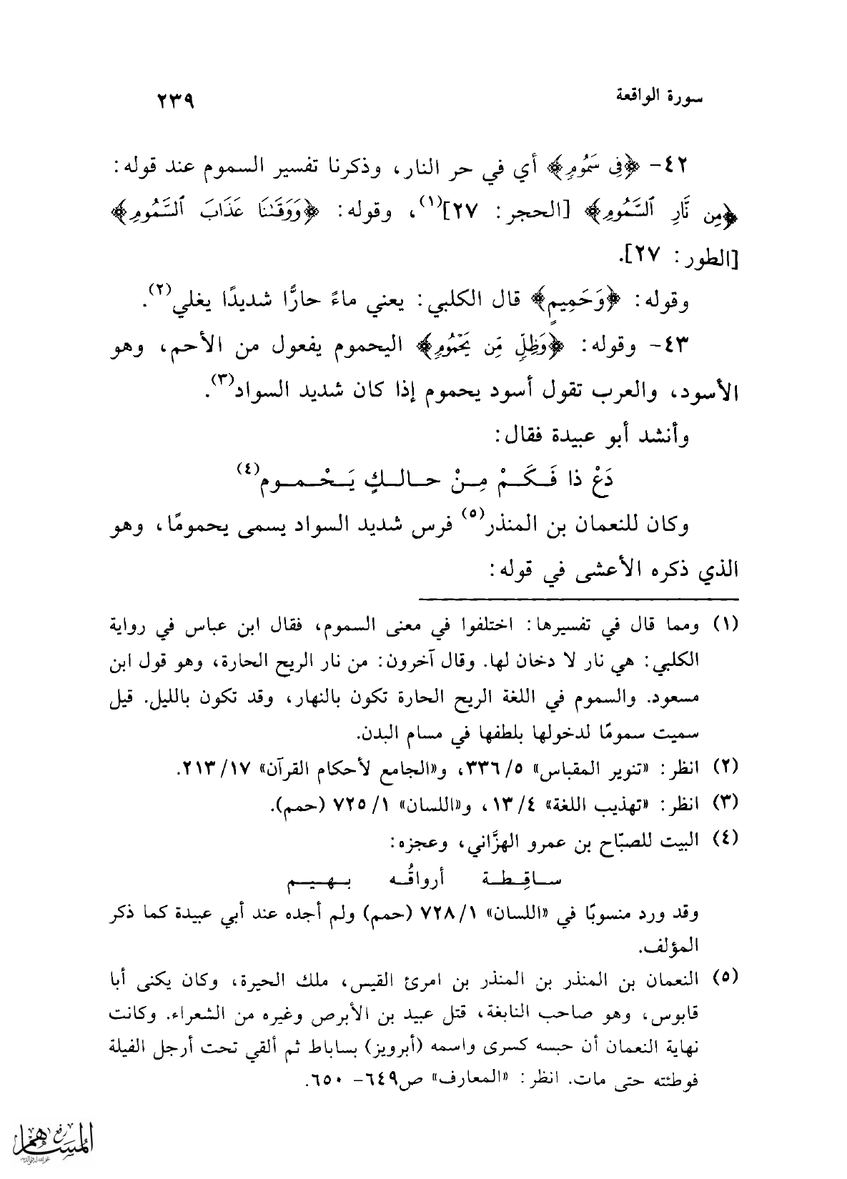 (¬1) ومما قال في تفسيرها: اختلفوا في معنى السموم، فقال ابن عباس في رواية الكلبي: هي نار لا دخان لها. وقال آخرون: من نار الريح الحارة، وهو قول ابن مسعود. والسموم في اللغة الريح الحارة تكون بالنهار، وقد تكون بالليل. قيل سميت سمومًا لدخولها بلطفها في مسام البدن.