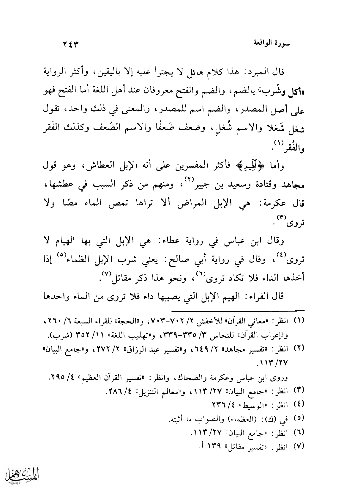وأما {الْهِيمِ} فأكثر المفسرين على أنه الإبل العطاش، وهو قول مجاهد وقتادة وسعيد بن جبير (¬2)، ومنهم من ذكر السبب في عطشها، قال عكرمة: هي الإبل المراض ألا تراها تمص الماء مصًا ولا تروى (¬3).