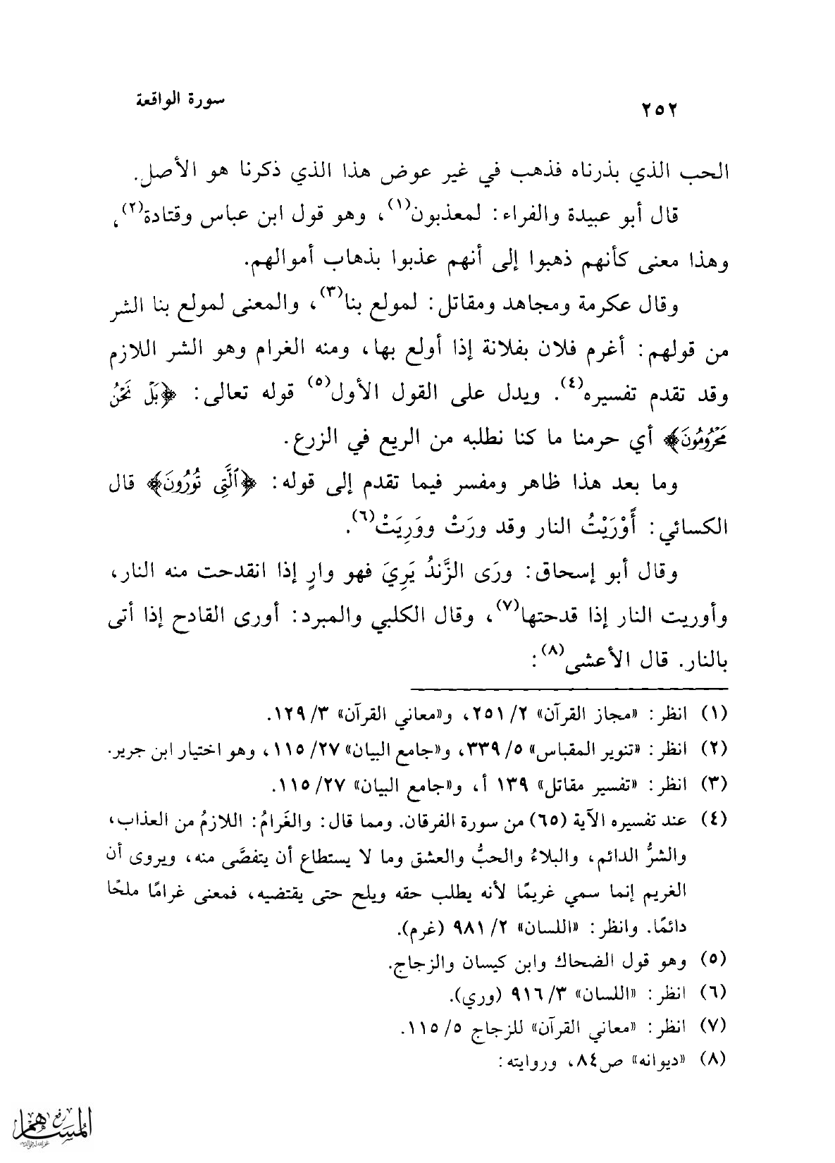 (¬4) عند تفسيره الآية (65) من سورة الفرقان. ومما قال: والغَرامُ: اللازمُ من العذاب، والشرُّ الدائم، والبلاءُ والحبُّ والعشق وما لا يستطاع أن يتفصَّى منه، ويروى أن الغريم إنما سمي غريمًا لأنه يطلب حقه ويلح حتى يقتضيه، فمعنى غرامًا ملحًا دائمًا. وانظر: "اللسان" 2/ 981 (غرم).