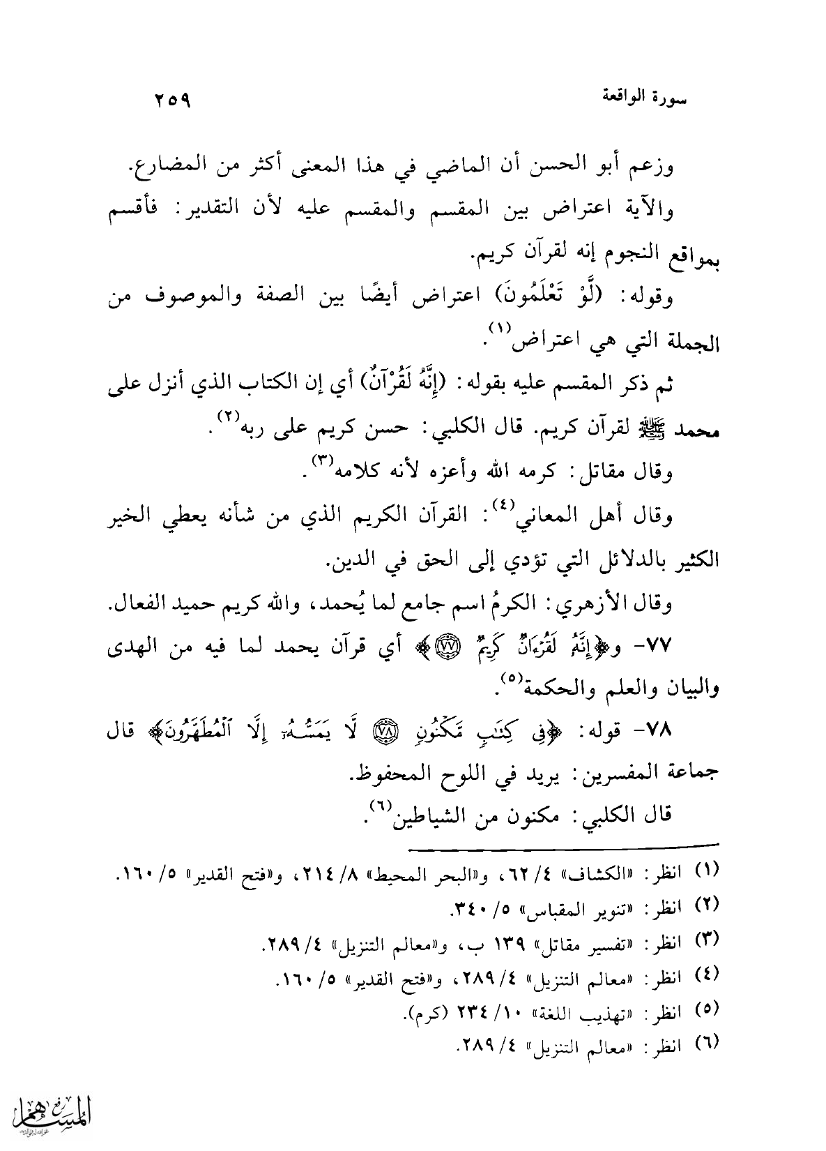 77 - و {إِنَّهُ لَقُرْآنٌ كَرِيمٌ (77)} أي قرآن يحمد لما فيه من الهدى والبيان والعلم والحكمة (¬5).