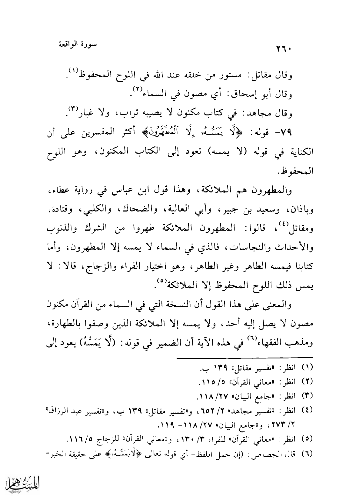 79 - قوله: {لَا يَمَسُّهُ إِلَّا الْمُطَهَّرُونَ} أكثر المفسرين على أن الكناية في قوله (لا يمسه) تعود إلى الكتاب المكنون، وهو اللوح المحفوظ.
