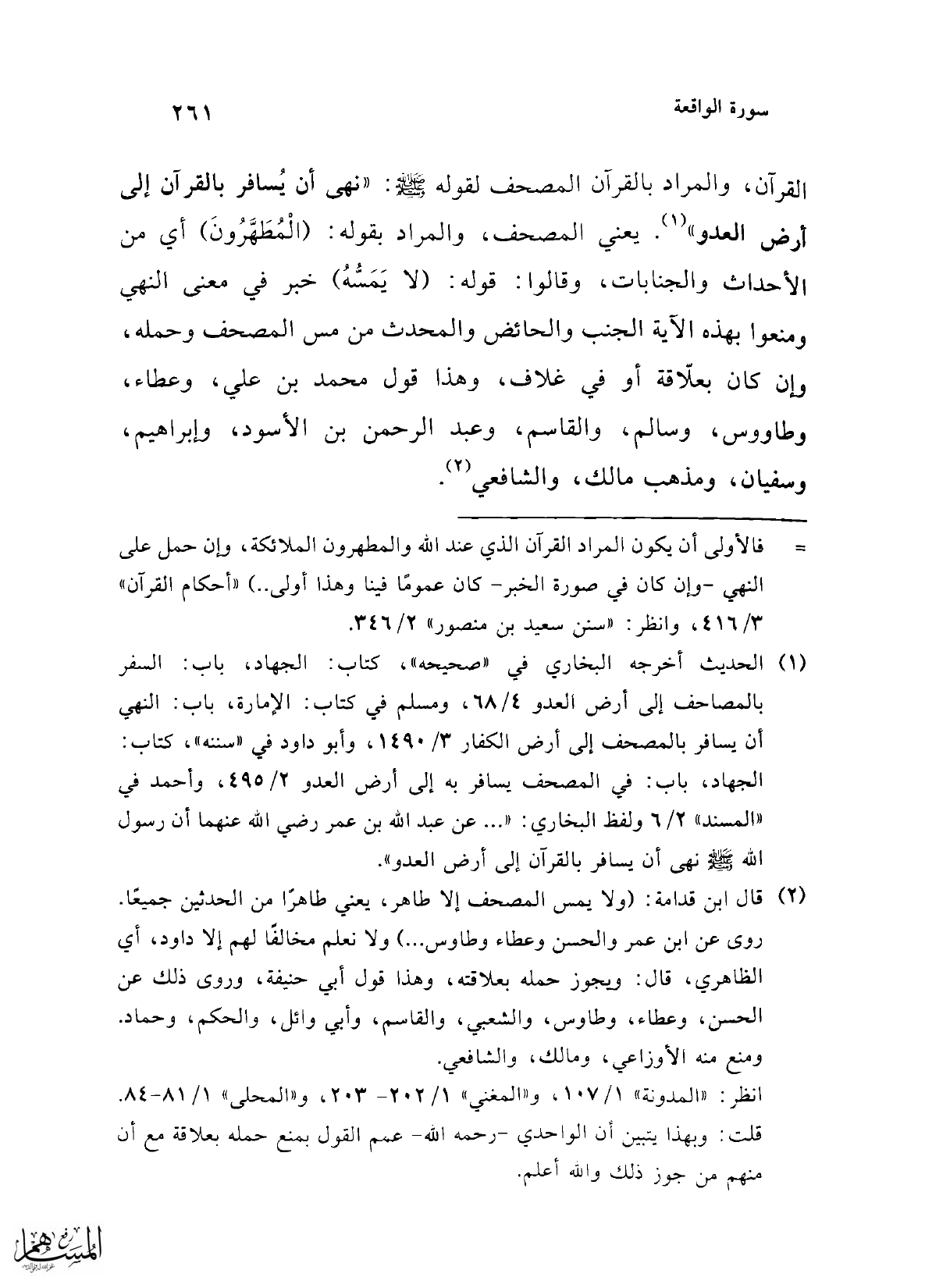 القرآن، والمراد بالقرآن المصحف لقوله -صلى الله عليه وسلم-: "نهى أن يُسافر بالقرآن إلى أرض العدو" (¬1). يعني المصحف، والمراد بقوله: (الْمُطَهَّرُونَ) أي من الأحداث والجنابات، وقالوا: قوله: (لا يَمَسُّهُ) خبر في معنى النهي ومنعوا بهذه الآية الجنب والحائض والمحدث من مس المصحف وحمله، وإن كان بعلاّقة أو في غلاف، وهذا قول محمد بن علي، وعطاء، وطاووس، وسالم، والقاسم، وعبد الرحمن بن الأسود، وإبراهيم، وسفيان، ومذهب مالك، والشافعي (¬2).