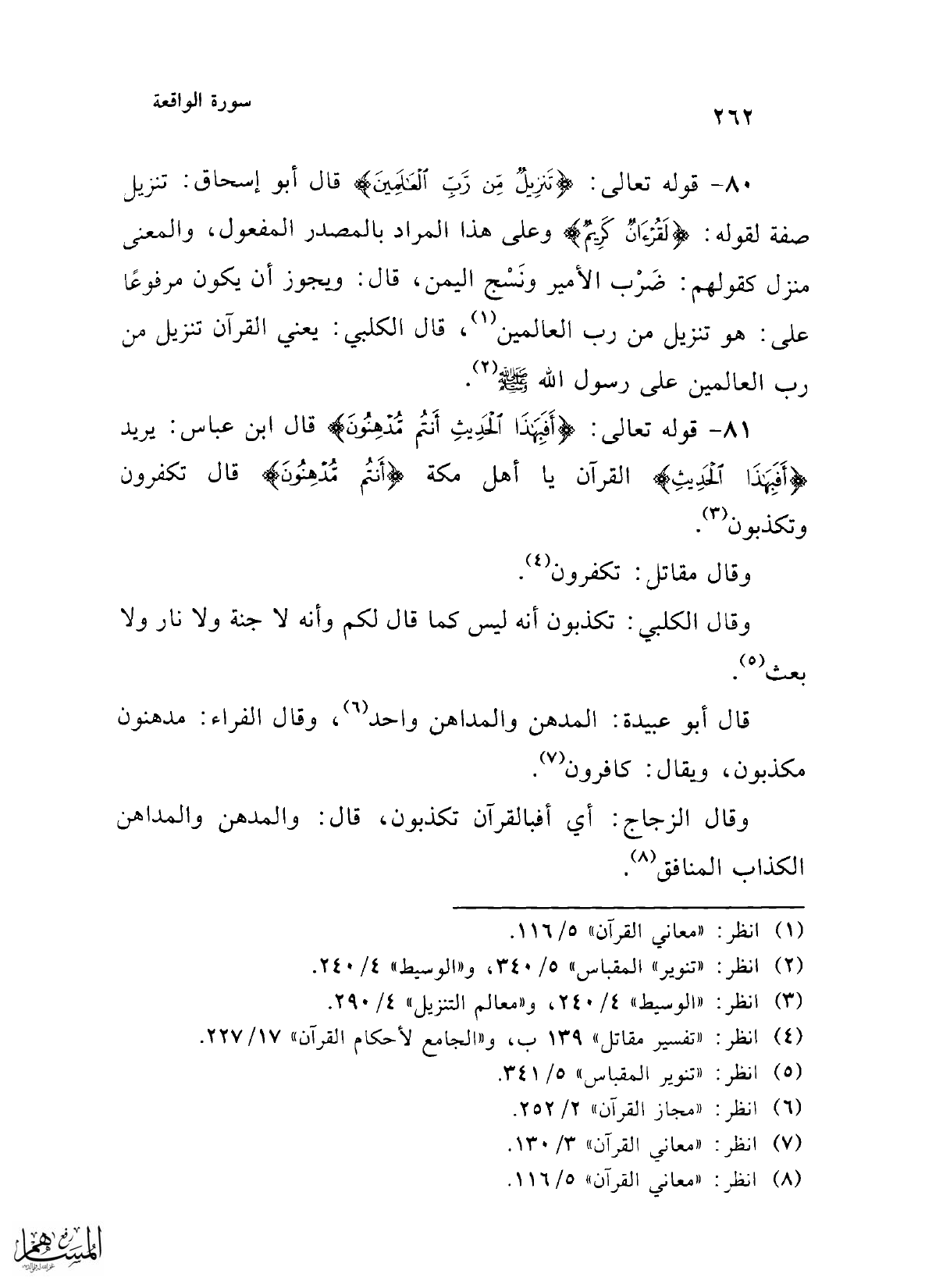 81 - قوله تعالى: {أَفَبِهَذَا الْحَدِيثِ أَنْتُمْ مُدْهِنُونَ} قال ابن عباس: يريد {أَفَبِهَذَا الْحَدِيثِ} القرآن يا أهل مكة {أَنْتُمْ مُدْهِنُونَ} قال تكفرون وتكذبون (¬3).