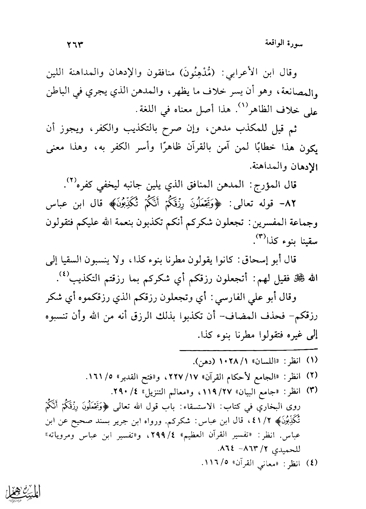 82 - قوله تعالى: {وَتَجْعَلُونَ رِزْقَكُمْ أَنَّكُمْ تُكَذِّبُونَ} قال ابن عباس وجماعة المفسرين: تجعلون شكركم أنكم تكذبون بنعمة الله عليكم فتقولون سقينا بنوء كذا (¬3).