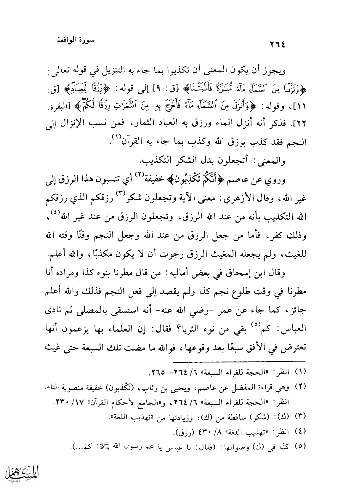 ويجوز أن يكون المعنى أن تكذبوا بما جاء به التنزيل في قوله تعالى: {وَنَزَّلْنَا مِنَ السَّمَاءِ مَاءً مُبَارَكًا فَأَنْبَتْنَا} [ق: 9] إلى قوله: {رِزْقًا لِلْعِبَادِ} [ق: 11]، وقوله: {وَأَنْزَلَ مِنَ السَّمَاءِ مَاءً فَأَخْرَجَ بِهِ مِنَ الثَّمَرَاتِ رِزْقًا لَكُمْ)} [البقرة: 22] فذكر أنه أنزل الماء ورزق به العباد الثمار، فمن نسب الإنزال إلى النجم فقد كذب برزق الله وكذب بما جاء به القرآن (¬1).