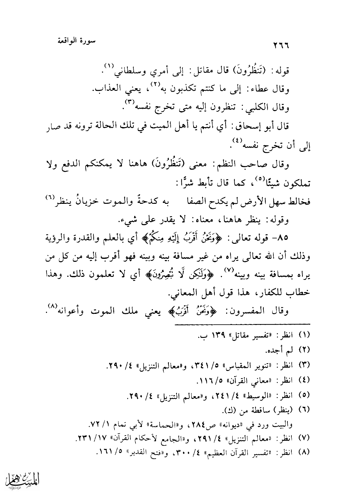 85 - قوله تعالى: {وَنَحْنُ أَقْرَبُ إِلَيْهِ مِنْكُمْ} أي بالعلم والقدرة والرؤية وذلك أن الله تعالى يراه من غير مسافة بينه وبينه فهو أقرب إليه من كل من يراه بمسافة بينه وبينه (¬7). {وَلَكِنْ لَا تُبْصِرُونَ} أي لا تعلمون ذلك. وهذا خطاب للكفار، هذا قول أهل المعاني.