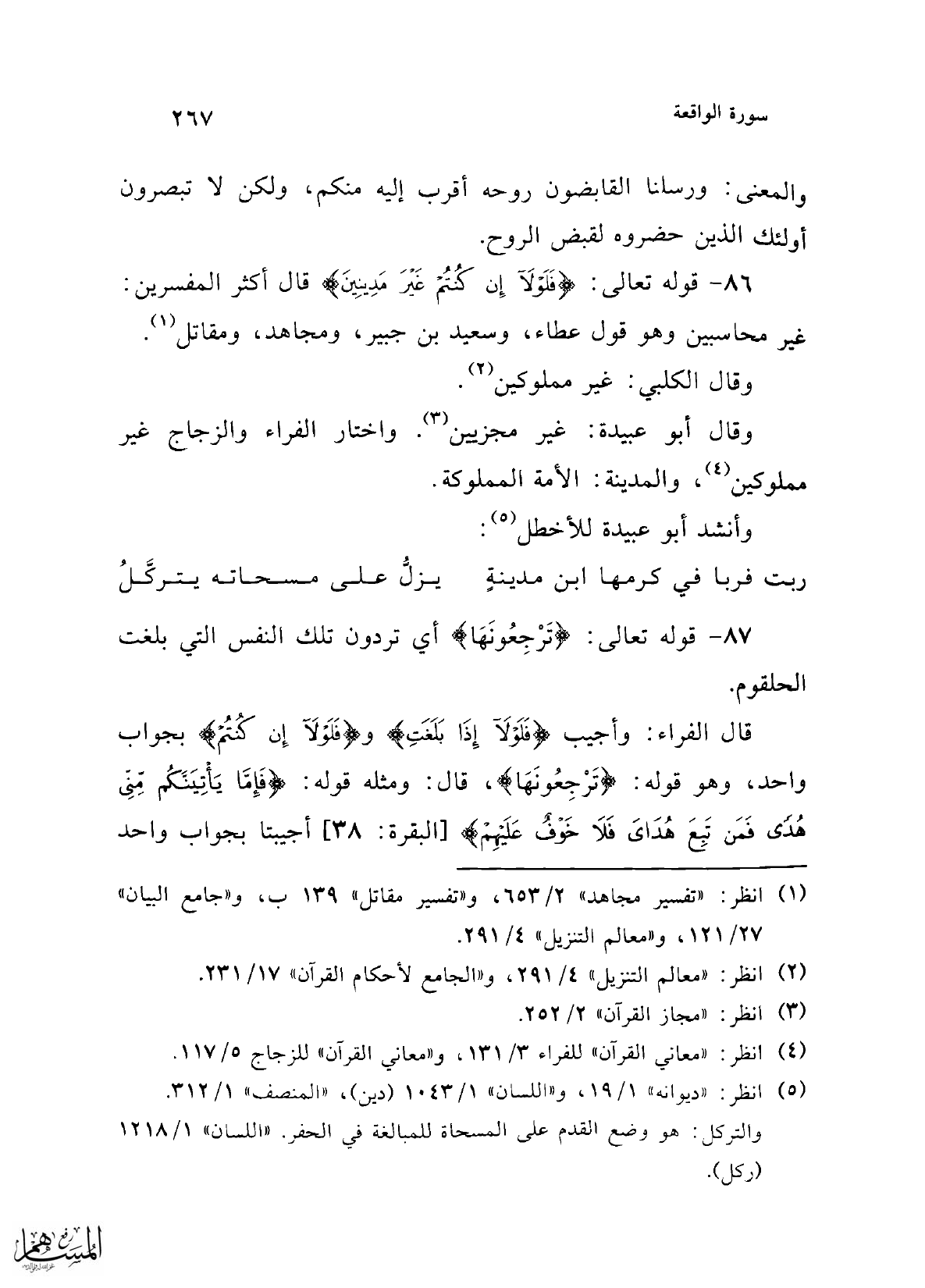 86 - قوله تعالى: {فَلَوْلَا إِنْ كُنْتُمْ غَيْرَ مَدِينِينَ} قال أكثر المفسرين: غير محاسبين وهو قول عطاء، وسعيد بن جبير، ومجاهد، ومقاتل (¬1).