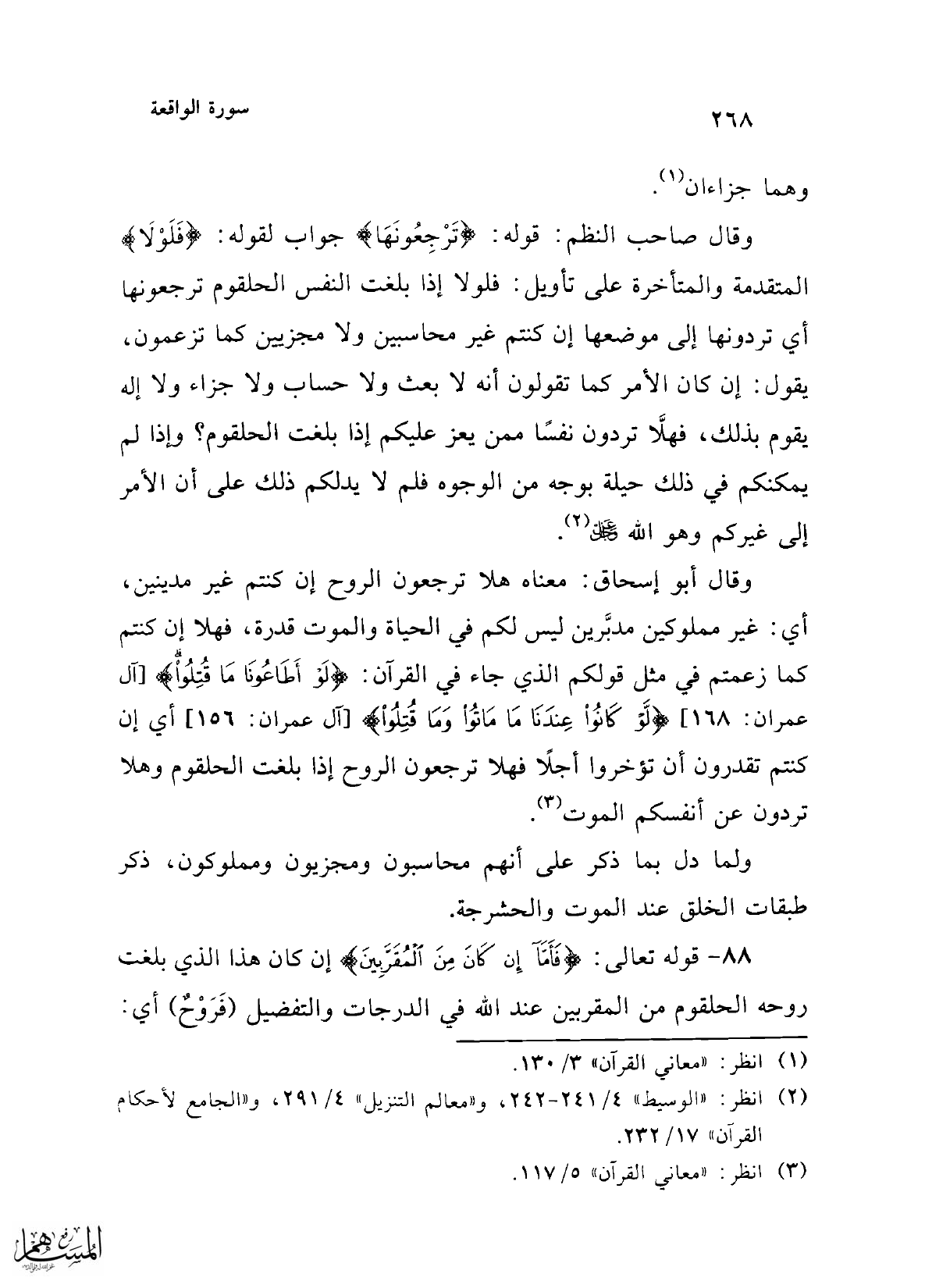 وقال أبو إسحاق: معناه هلا ترجعون الروح إن كنتم غير مدينين، أي: غير مملوكين مدبَّرين ليس لكم في الحياة والموت قدرة، فهلا إن كنتم كما زعمتم في مثل قولكم الذي جاء في القرآن: {لَوْ أَطَاعُونَا مَا قُتِلُوا} [آل عمران: 168] {لَوْ كَانُوا عِنْدَنَا مَا مَاتُوا وَمَا قُتِلُوا} [آل عمران: 156] أي إن كنتم تقدرون أن تؤخروا أجلًا فهلا ترجعون الروح إذا بلغت الحلقوم وهلا تردون عن أنفسكم الموت (¬3).
