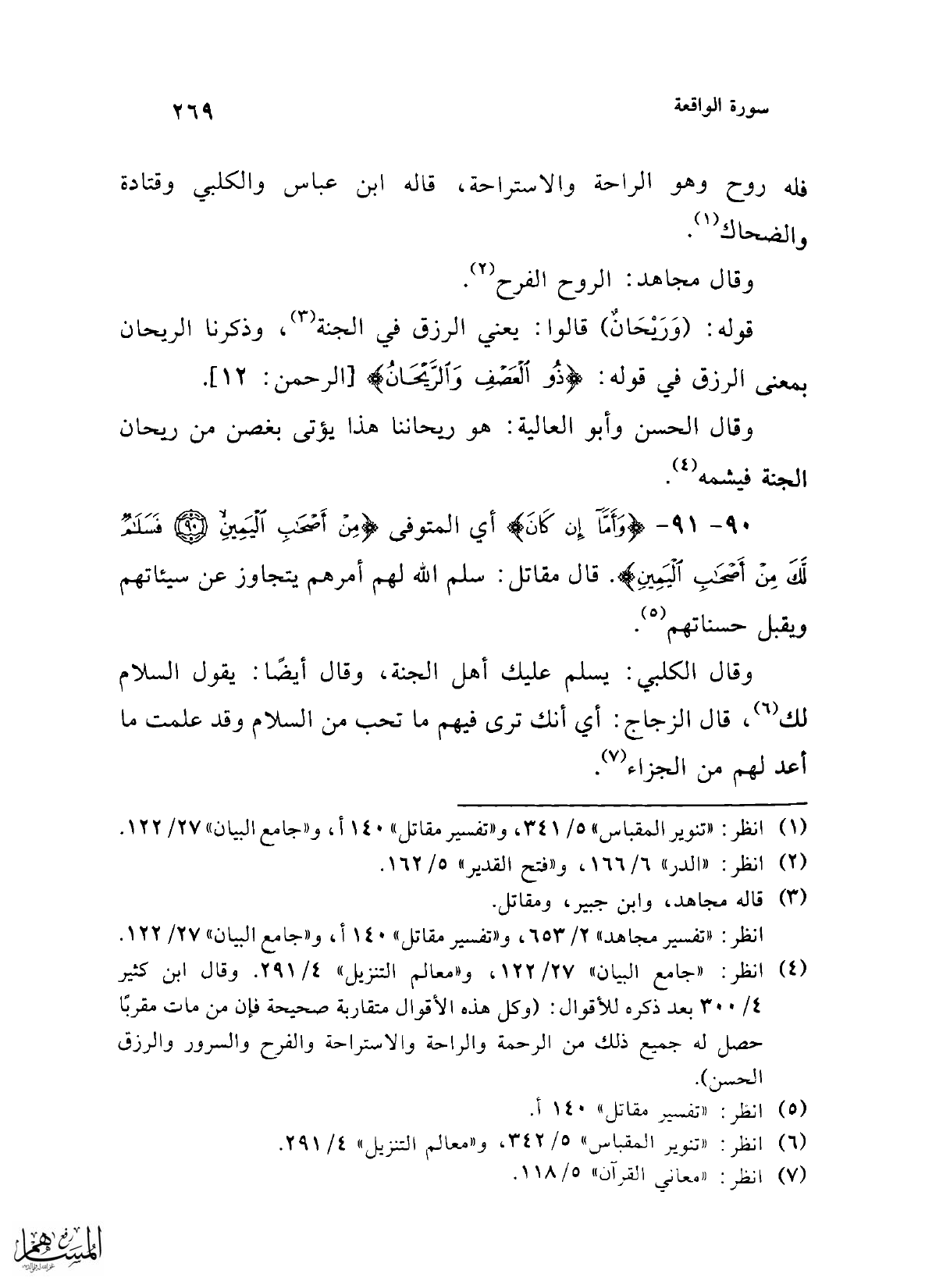 (¬4) انظر: "جامع البيان" 27/ 122، و"معالم التنزيل" 4/ 291. وقال ابن كثير 4/ 300 بعد ذكره للأقوال: (وكل هذه الأقوال متقاربة صحيحة فإن من مات مقربًا حصل له جميع ذلك من الرحمة والراحة والاستراحة والفرح والسرور والرزق الحسن).