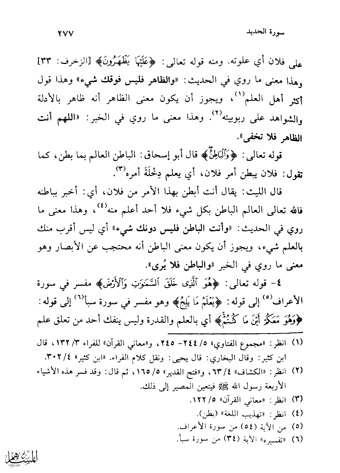 4 - قوله تعالى: {هُوَ الَّذِي خَلَقَ السَّمَاوَاتِ وَالْأَرْضَ} مفسر في سورة الأعراف (¬5) إلى قوله: {يَعْلَمُ مَا يَلِجُ} وهو مفسر في سورة سبأ (¬6) إلى قوله: {وَهُوَ مَعَكُمْ أَيْنَ مَا كُنْتُمْ} أي بالعلم والقدرة وليس ينفك أحد من تعلق علم